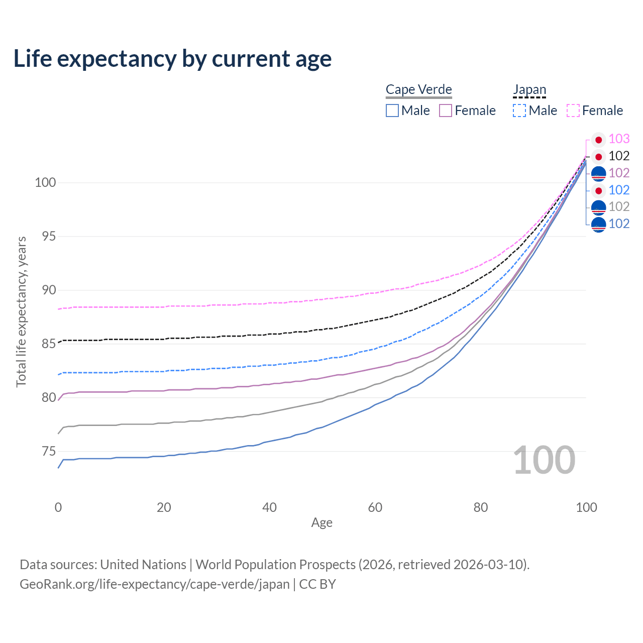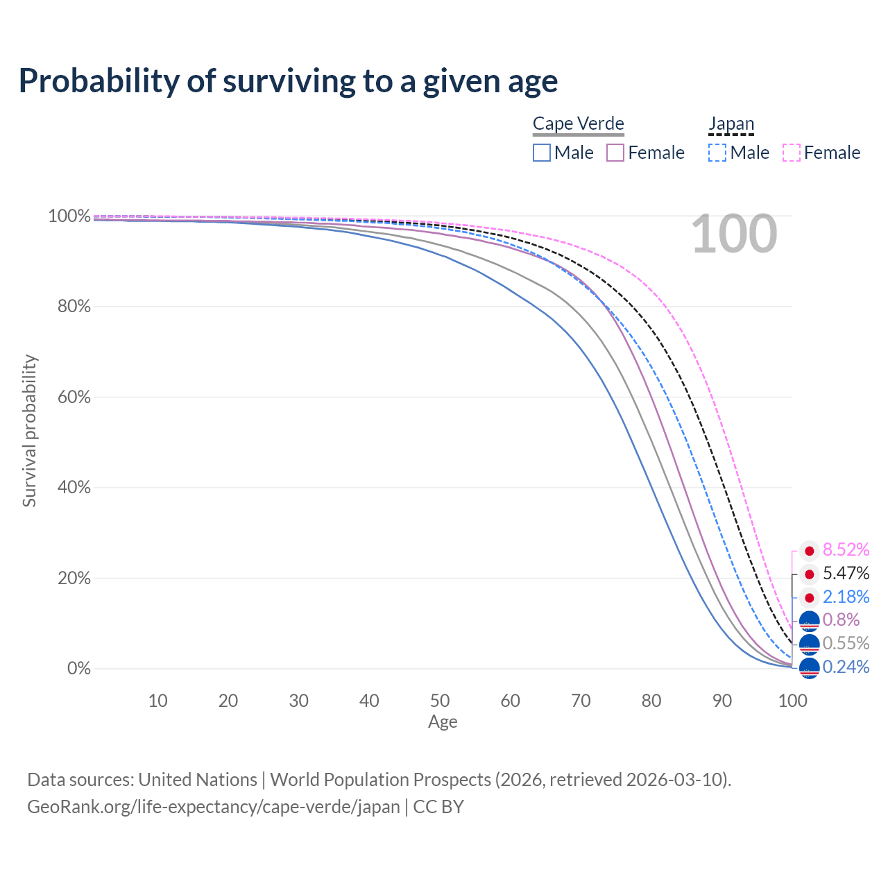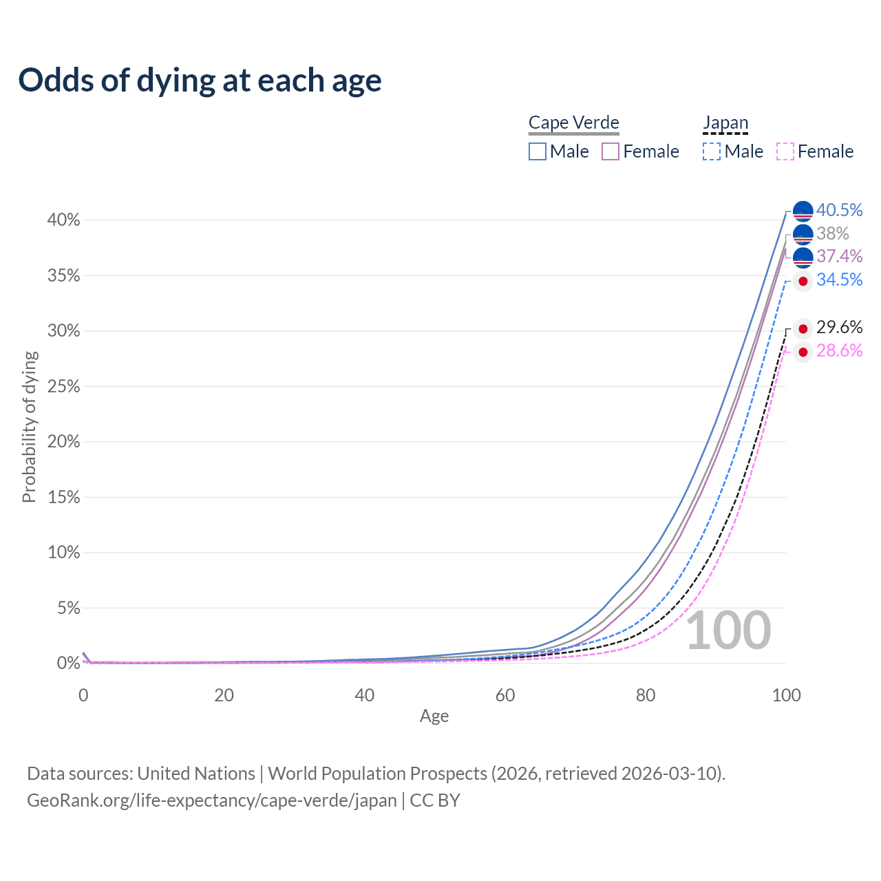 This life expectancy calculator shows the odds of living to 100, 95, 90, and below based on current age for both males and females in Cape Verde and Japan, along with mean and median age of death. The calculations are based on the 2026 life tables (actuarial tables) from the UN World Population Prospects.