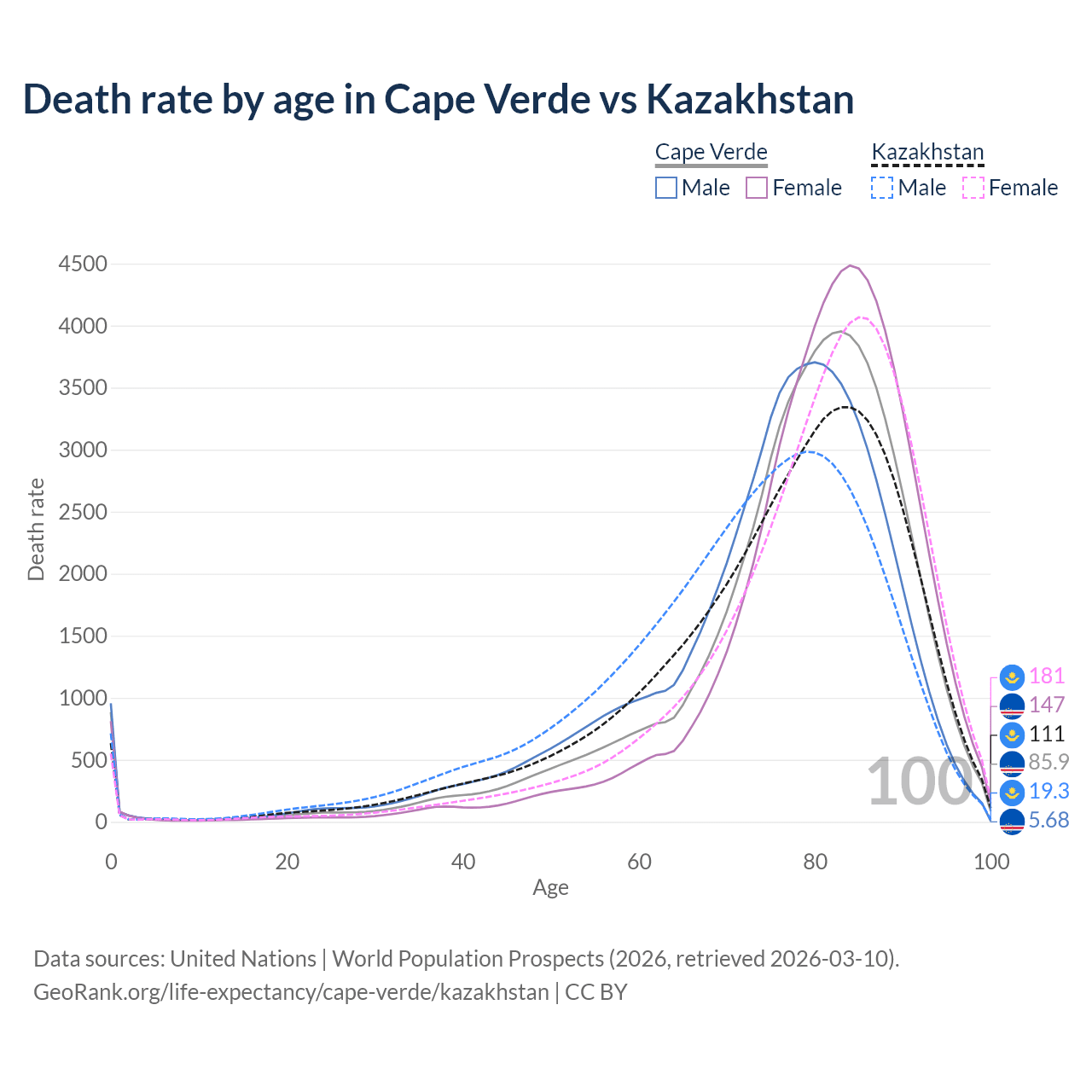 In Cape Verde, the most common age of death is 83, compared to 84 in Kazakhstan. The median age of death is 80.1 in Cape Verde and 78.6 in Kazakhstan, meaning only half of each cohort is expected to live past that age.