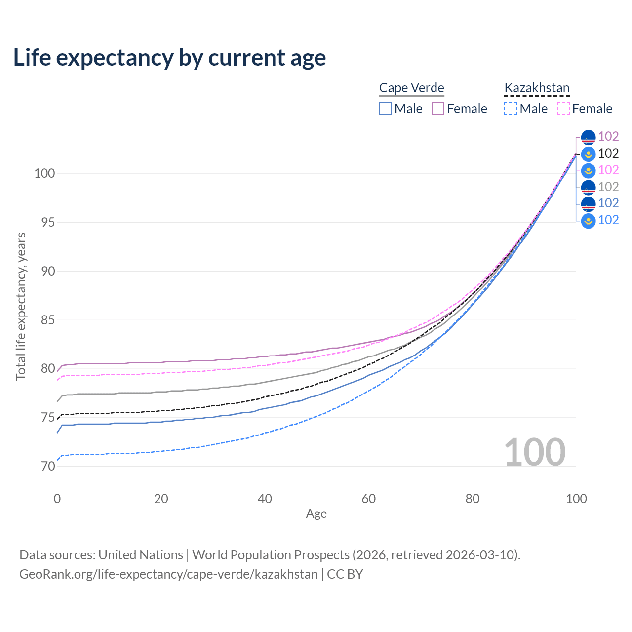 This life expectancy calculator shows the odds of living to 100, 95, 90, and below based on current age for both males and females in Cape Verde and Kazakhstan, along with mean and median age of death. The calculations are based on the 2026 life tables (actuarial tables) from the UN World Population Prospects.