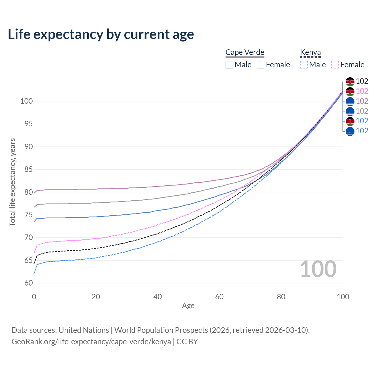 This life expectancy calculator shows the odds of living to 100, 95, 90, and below based on current age for both males and females in Cape Verde and Kenya, along with mean and median age of death. The calculations are based on the 2026 life tables (actuarial tables) from the UN World Population Prospects.