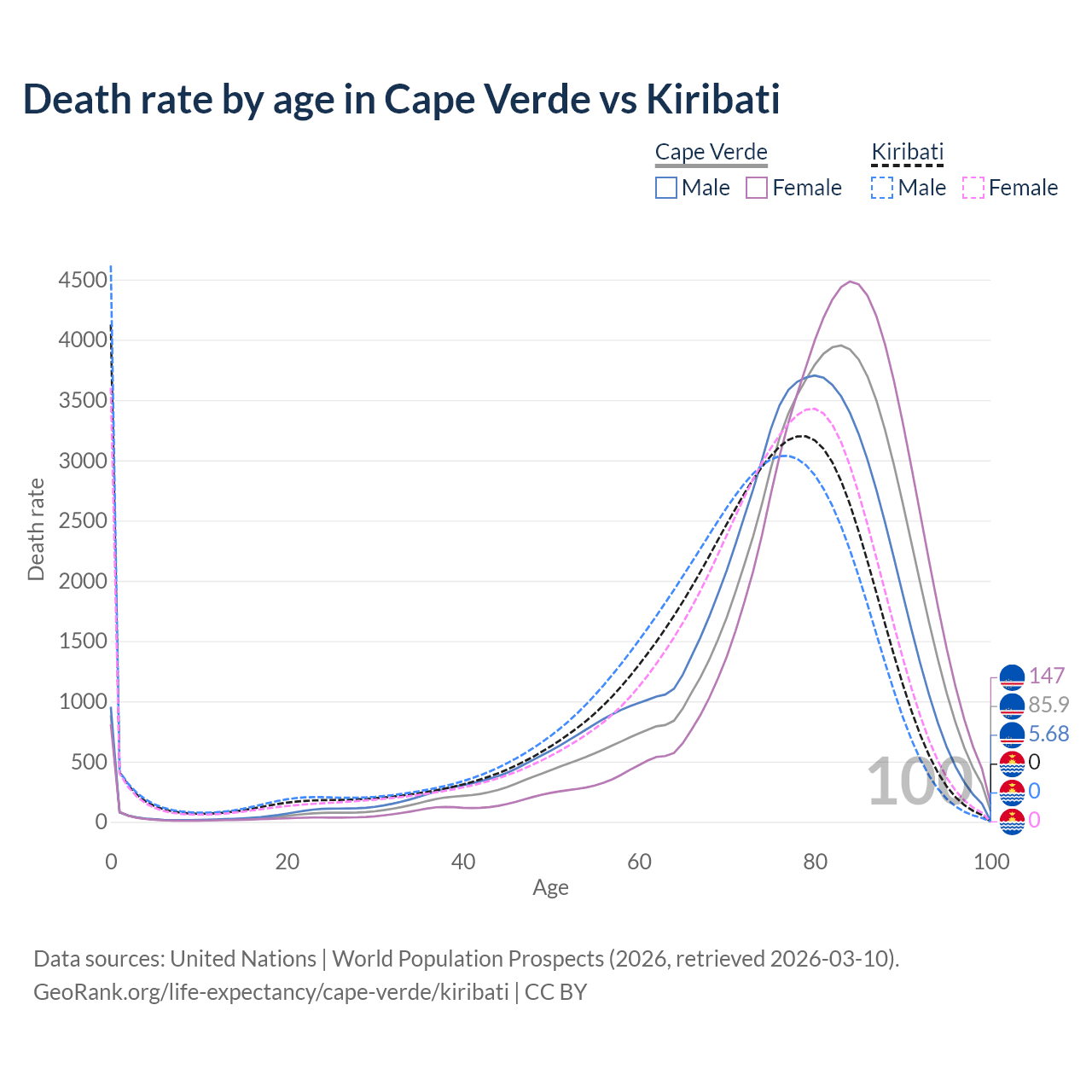 In Cape Verde, the most common age of death is 83, compared to 0 in Kiribati. The median age of death is 80.1 in Cape Verde and 73.1 in Kiribati, meaning only half of each cohort is expected to live past that age.