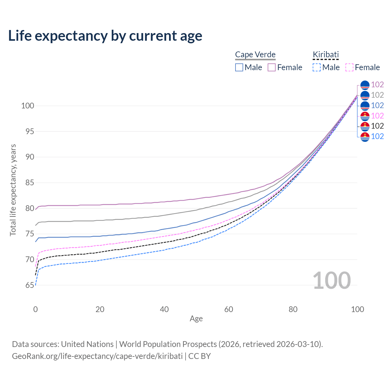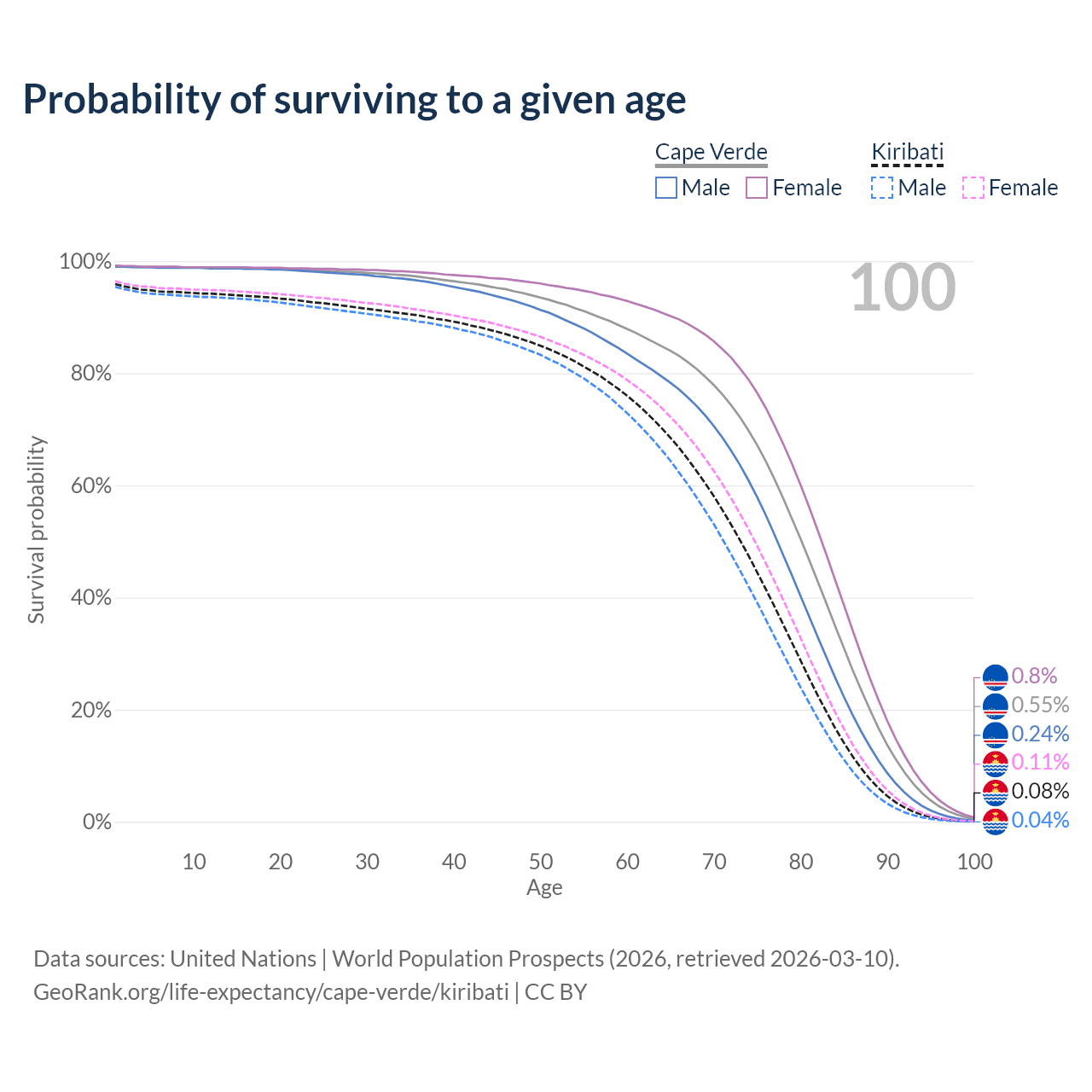 This life expectancy calculator shows the odds of living to 100, 95, 90, and below based on current age for both males and females in Cape Verde and Kiribati, along with mean and median age of death. The calculations are based on the 2026 life tables (actuarial tables) from the UN World Population Prospects.