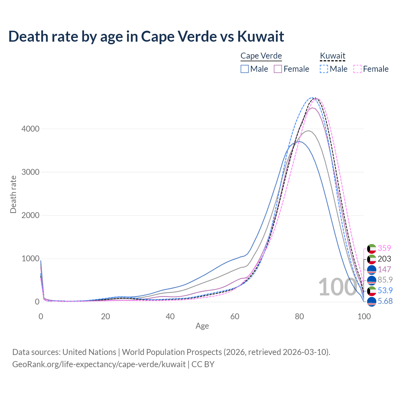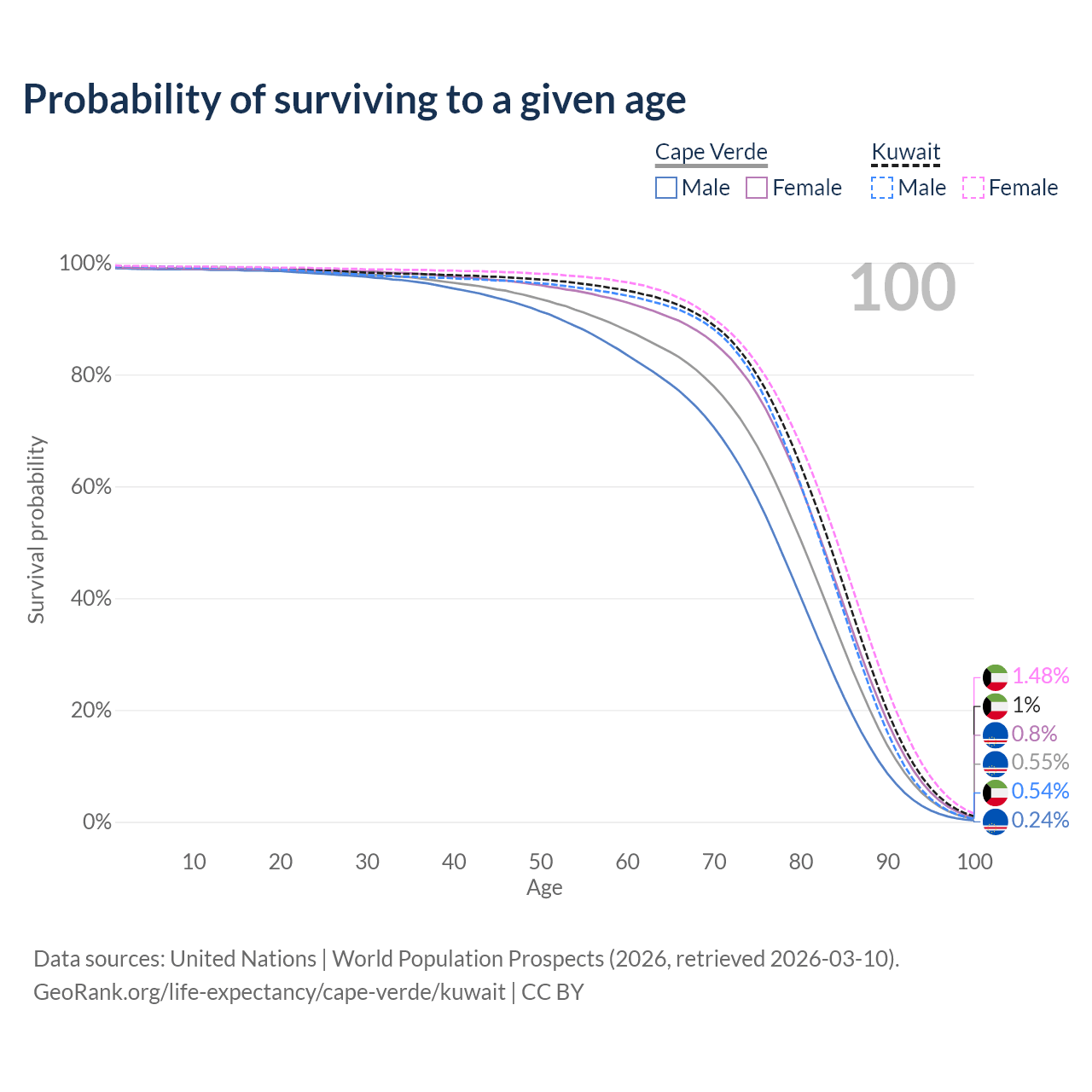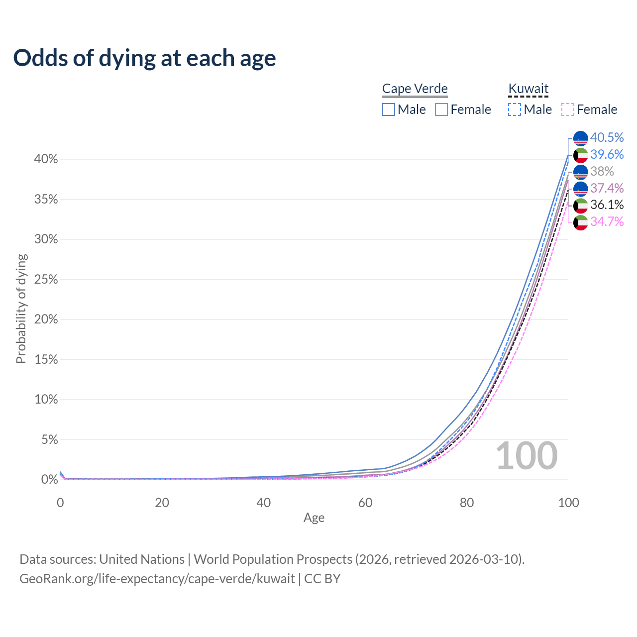 This life expectancy calculator shows the odds of living to 100, 95, 90, and below based on current age for both males and females in Cape Verde and Kuwait, along with mean and median age of death. The calculations are based on the 2026 life tables (actuarial tables) from the UN World Population Prospects.