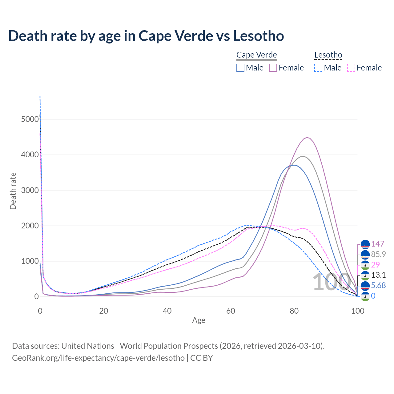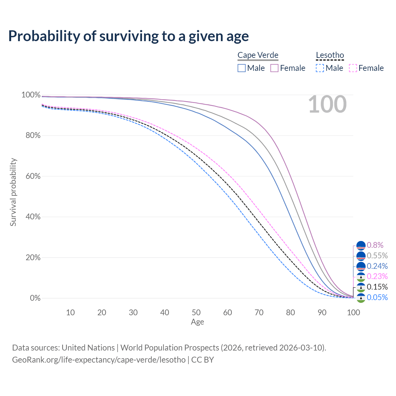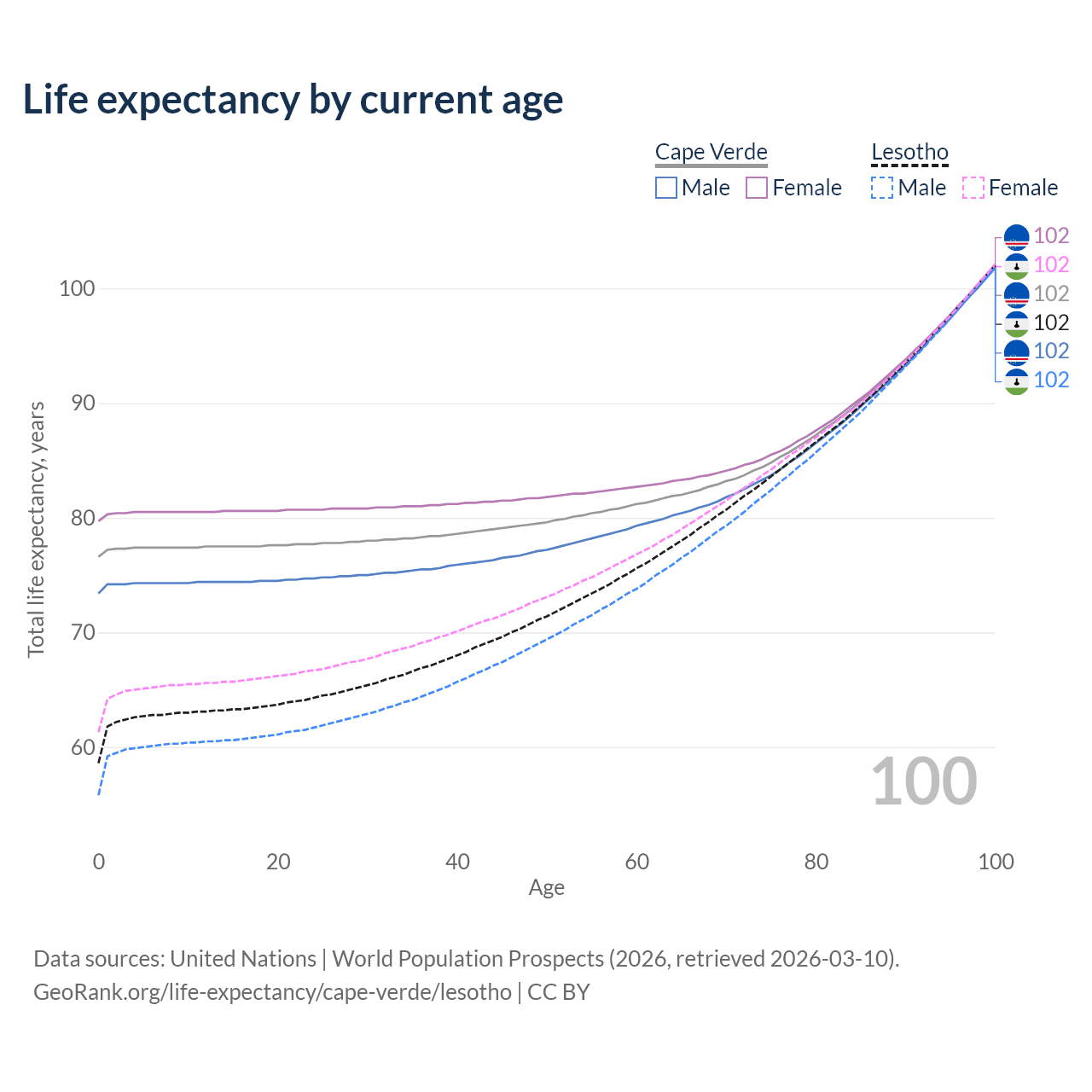 This life expectancy calculator shows the odds of living to 100, 95, 90, and below based on current age for both males and females in Cape Verde and Lesotho, along with mean and median age of death. The calculations are based on the 2026 life tables (actuarial tables) from the UN World Population Prospects.