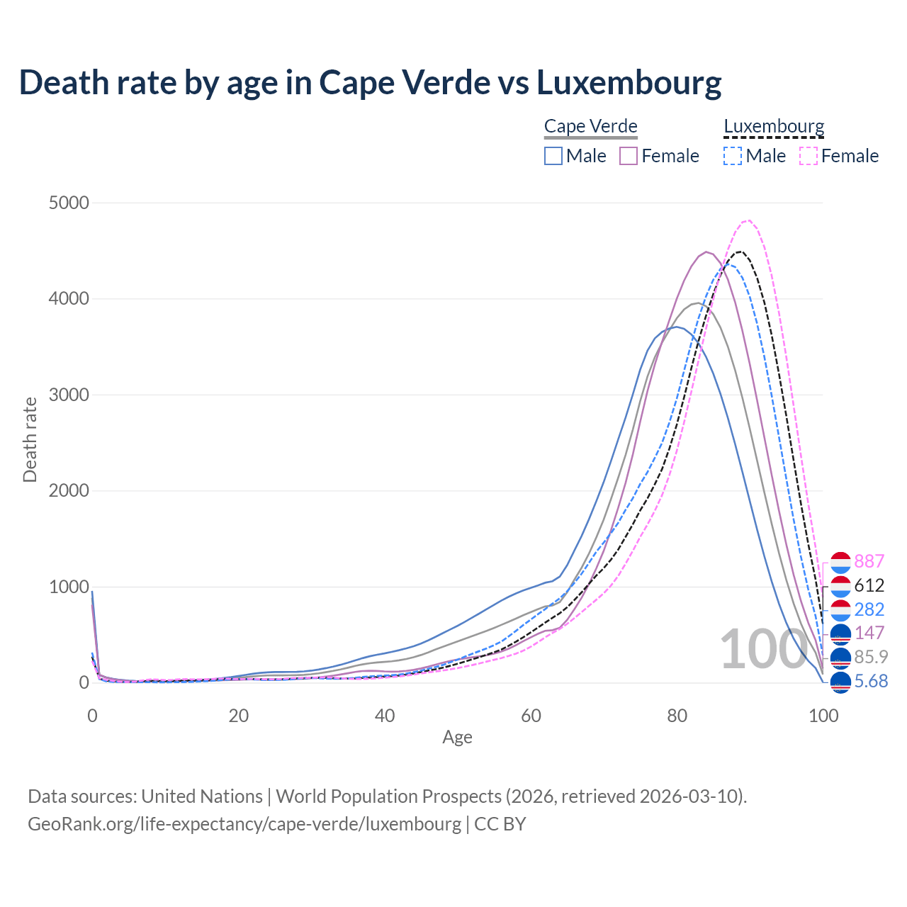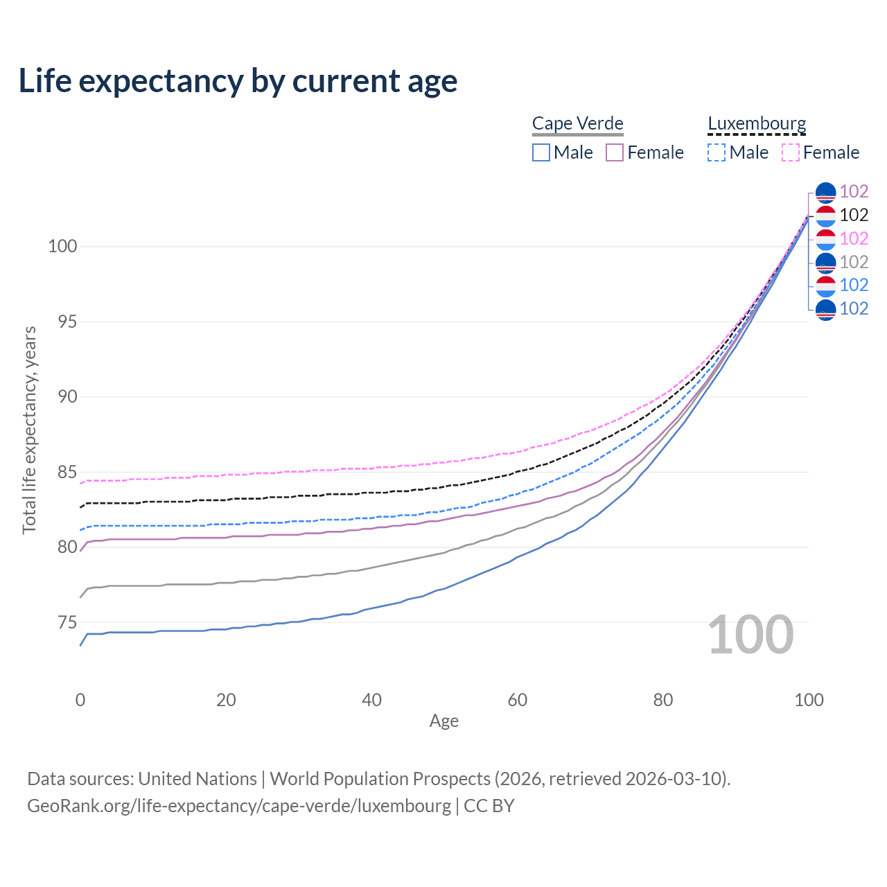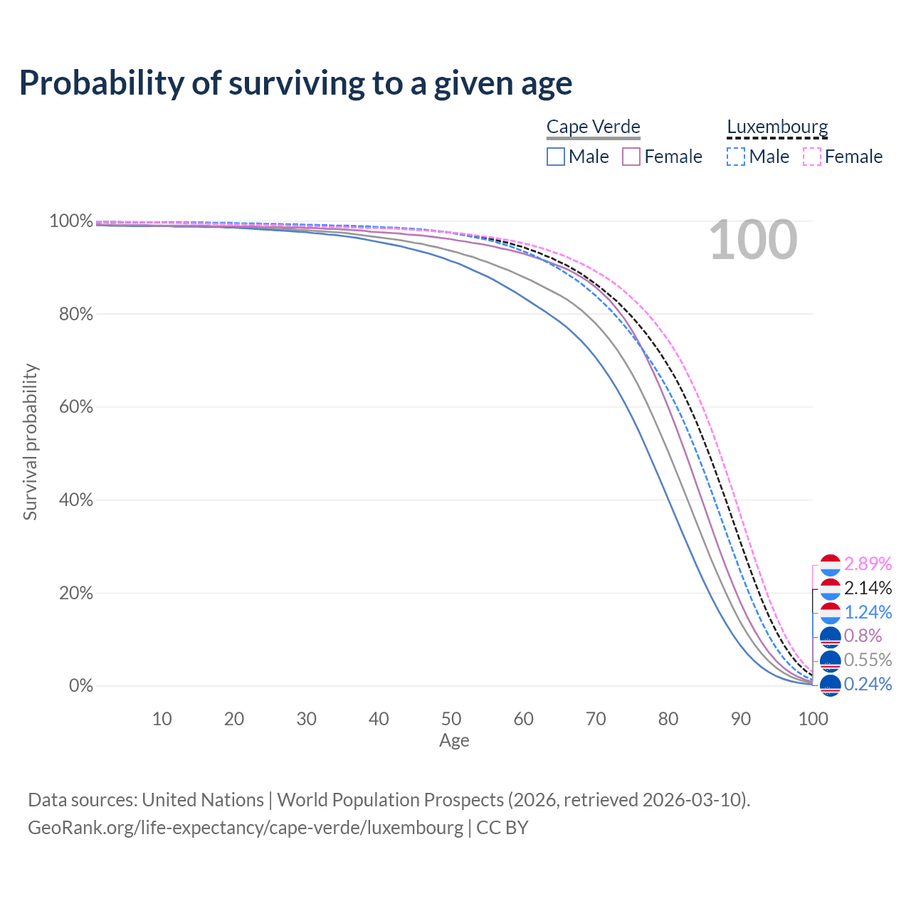 This life expectancy calculator shows the odds of living to 100, 95, 90, and below based on current age for both males and females in Cape Verde and Luxembourg, along with mean and median age of death. The calculations are based on the 2026 life tables (actuarial tables) from the UN World Population Prospects.