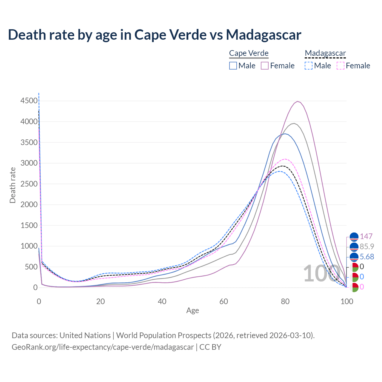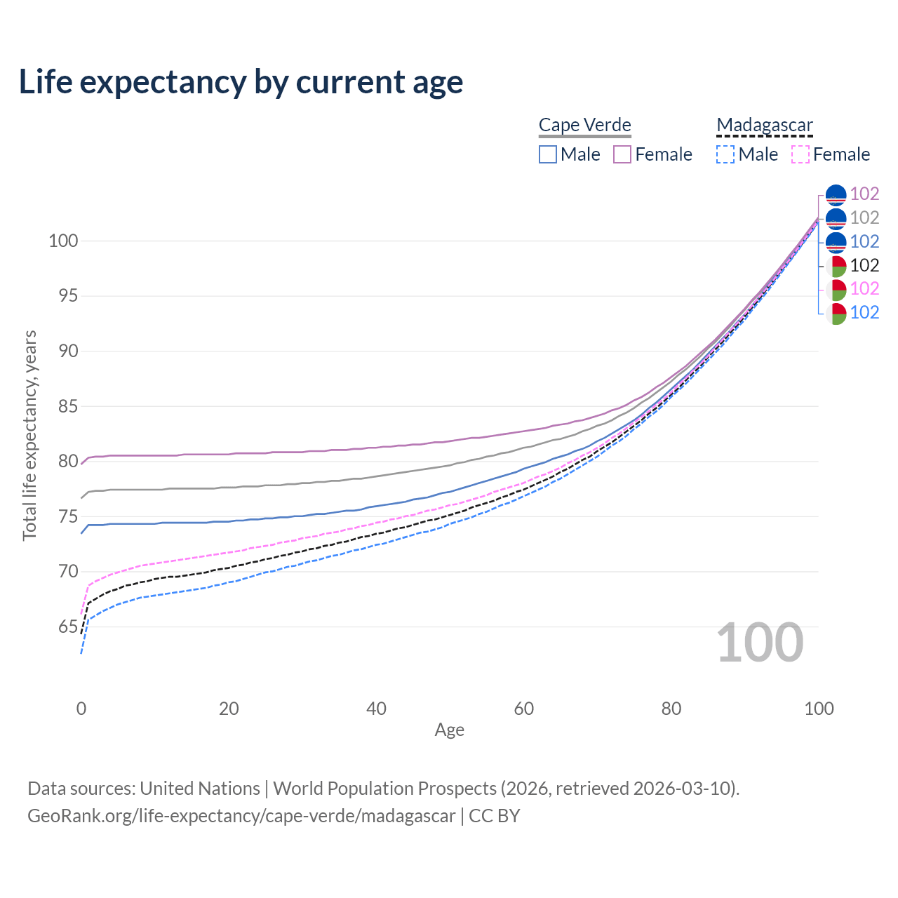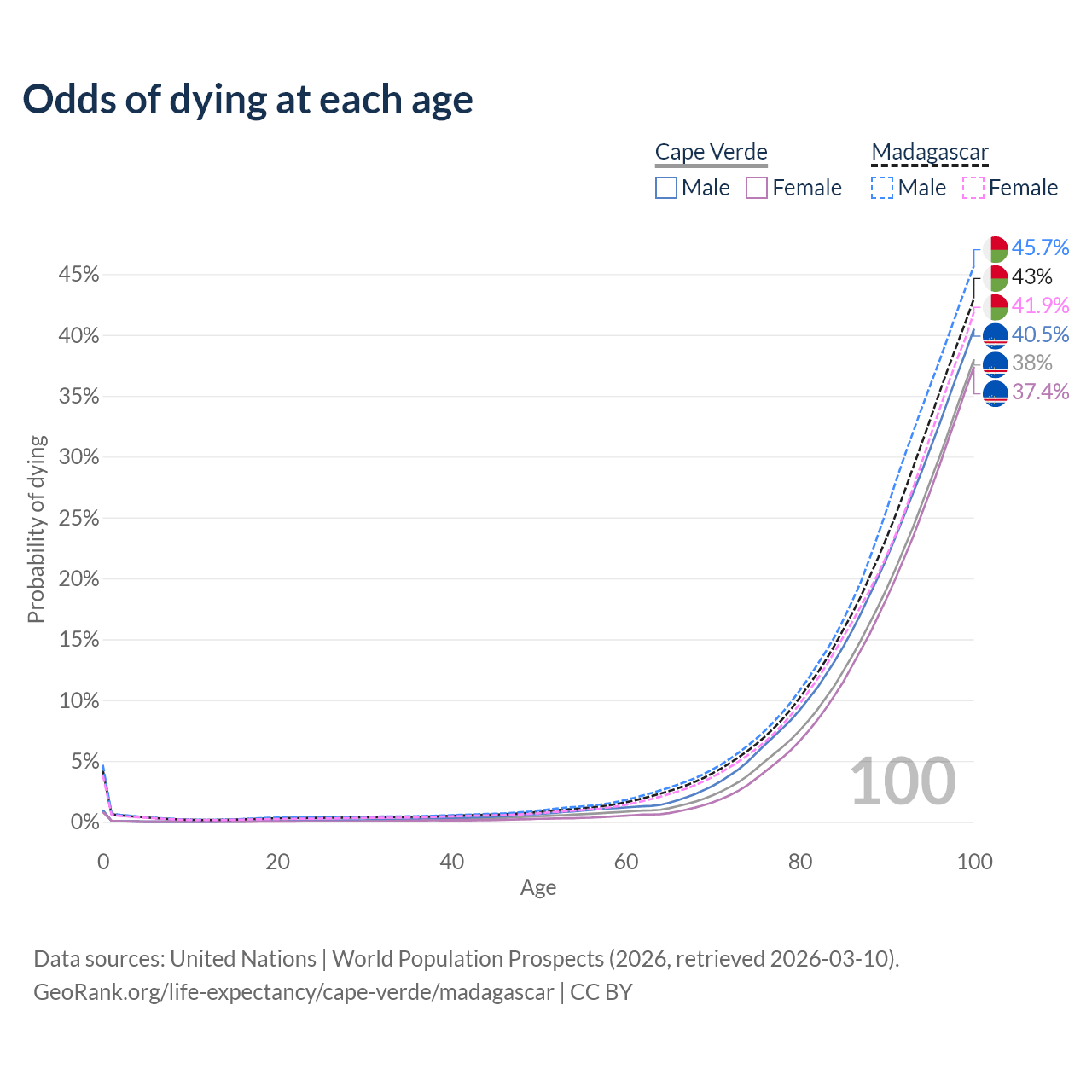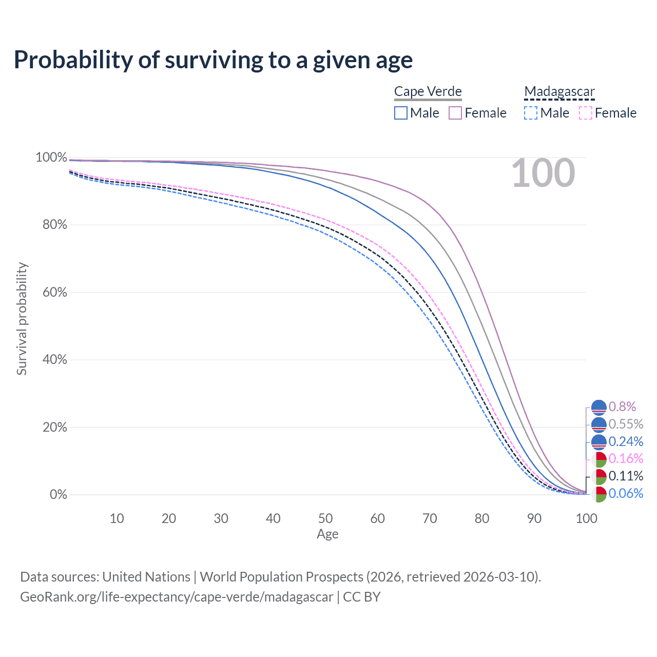 This life expectancy calculator shows the odds of living to 100, 95, 90, and below based on current age for both males and females in Cape Verde and Madagascar, along with mean and median age of death. The calculations are based on the 2026 life tables (actuarial tables) from the UN World Population Prospects.