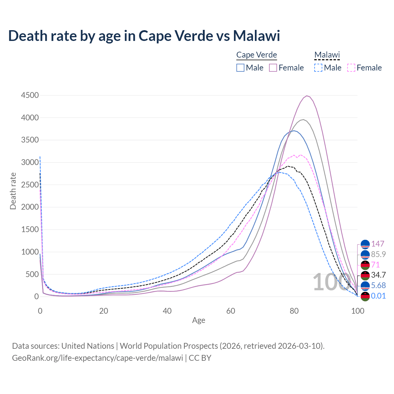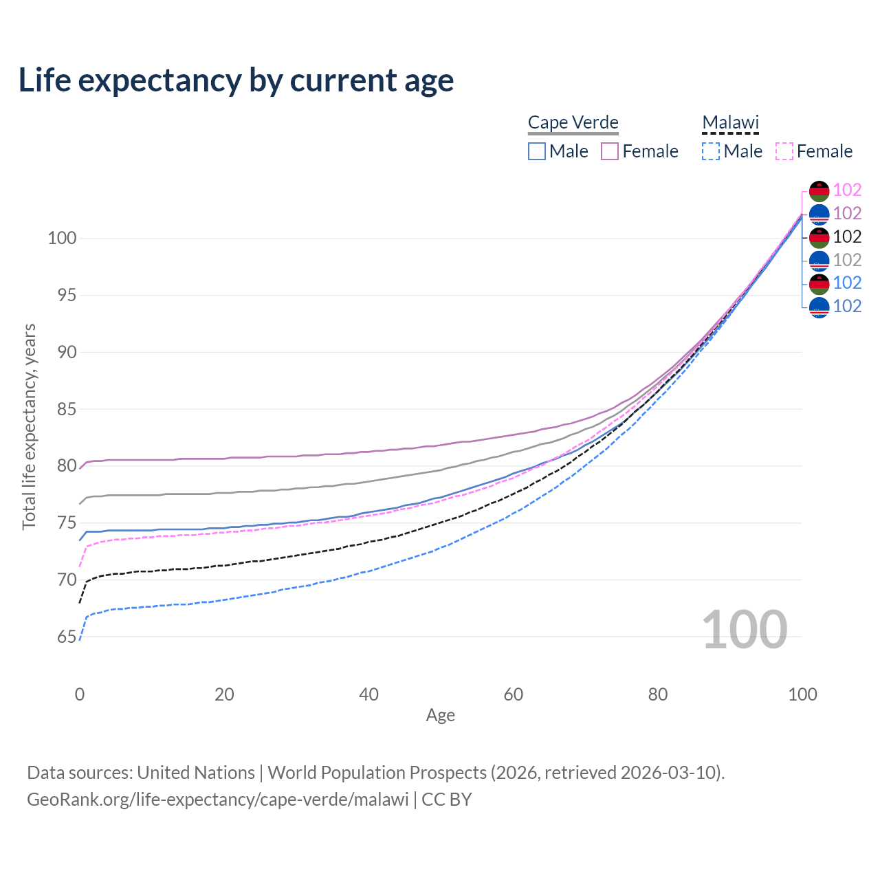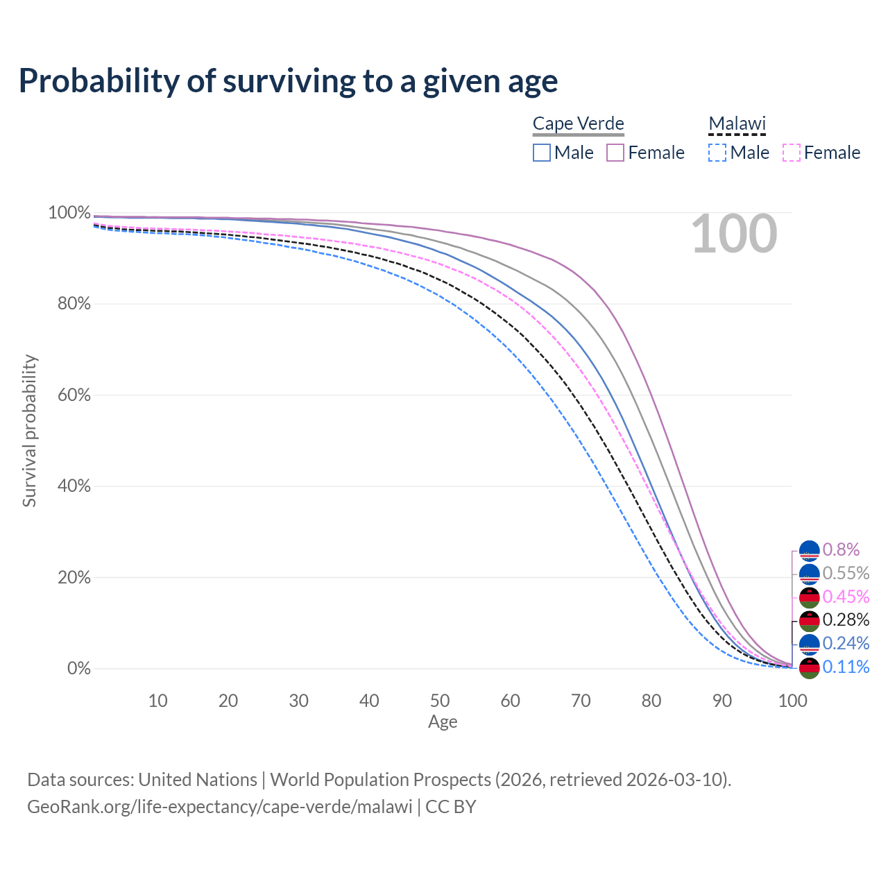 This life expectancy calculator shows the odds of living to 100, 95, 90, and below based on current age for both males and females in Cape Verde and Malawi, along with mean and median age of death. The calculations are based on the 2026 life tables (actuarial tables) from the UN World Population Prospects.