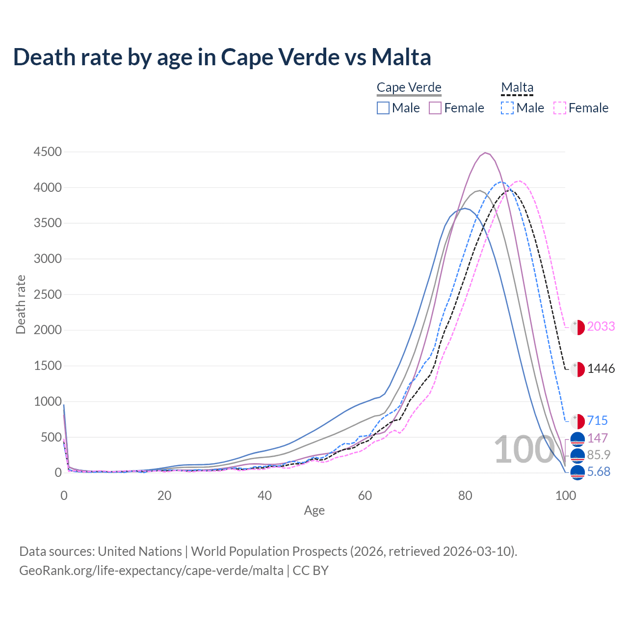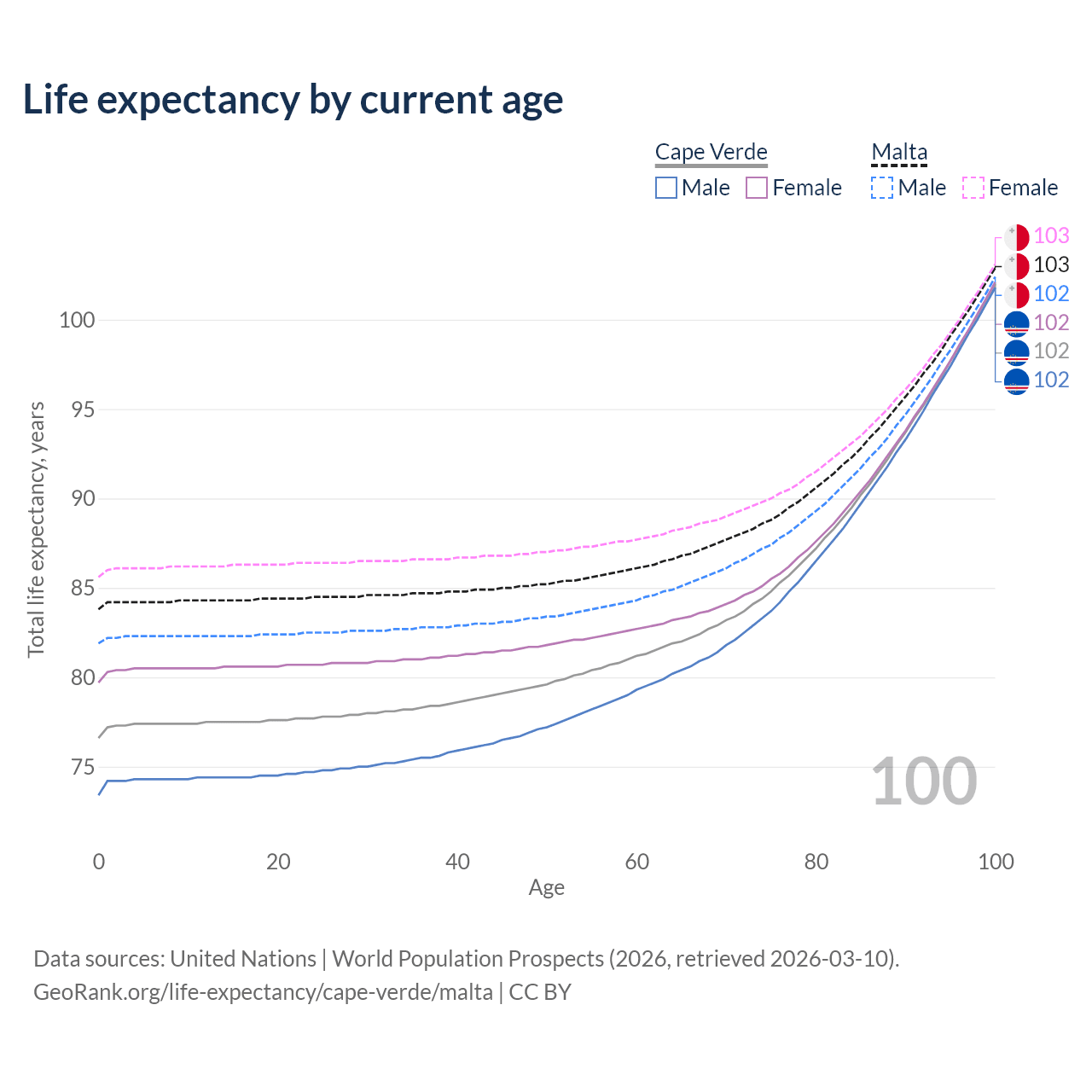 This life expectancy calculator shows the odds of living to 100, 95, 90, and below based on current age for both males and females in Cape Verde and Malta, along with mean and median age of death. The calculations are based on the 2026 life tables (actuarial tables) from the UN World Population Prospects.