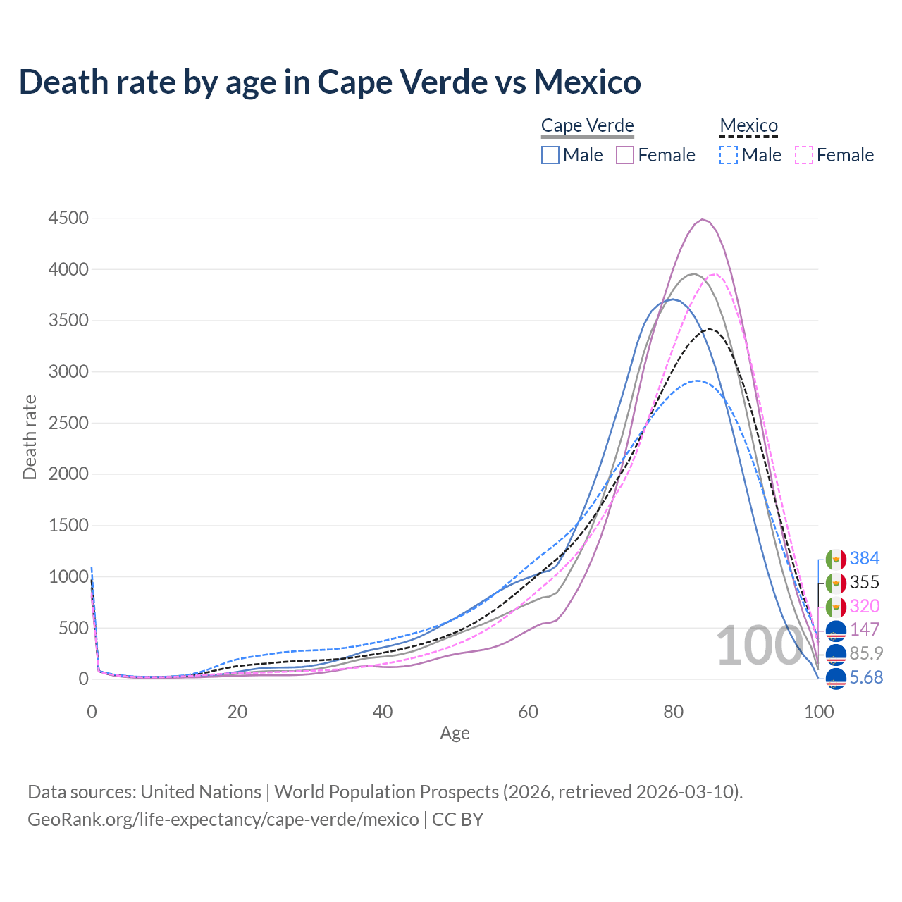 In Cape Verde, the most common age of death is 83, compared to 85 in Mexico. The median age of death is 80.1 in Cape Verde and 80.1 in Mexico, meaning only half of each cohort is expected to live past that age.