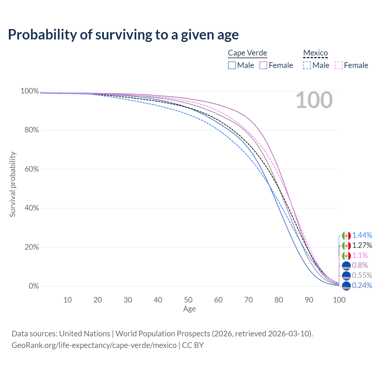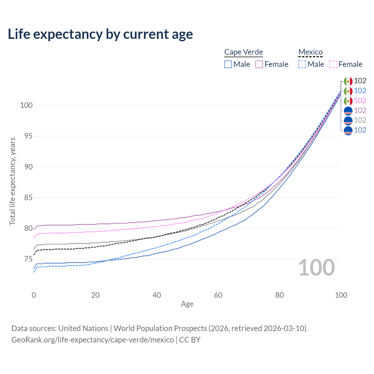 This life expectancy calculator shows the odds of living to 100, 95, 90, and below based on current age for both males and females in Cape Verde and Mexico, along with mean and median age of death. The calculations are based on the 2026 life tables (actuarial tables) from the UN World Population Prospects.