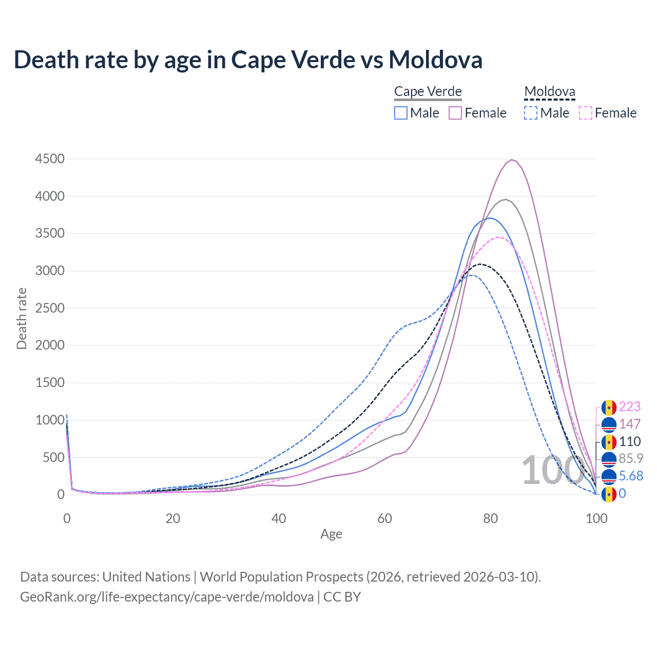This life expectancy calculator shows the odds of living to 100, 95, 90, and below based on current age for both males and females in Cape Verde and Moldova, along with mean and median age of death. The calculations are based on the 2026 life tables (actuarial tables) from the UN World Population Prospects.