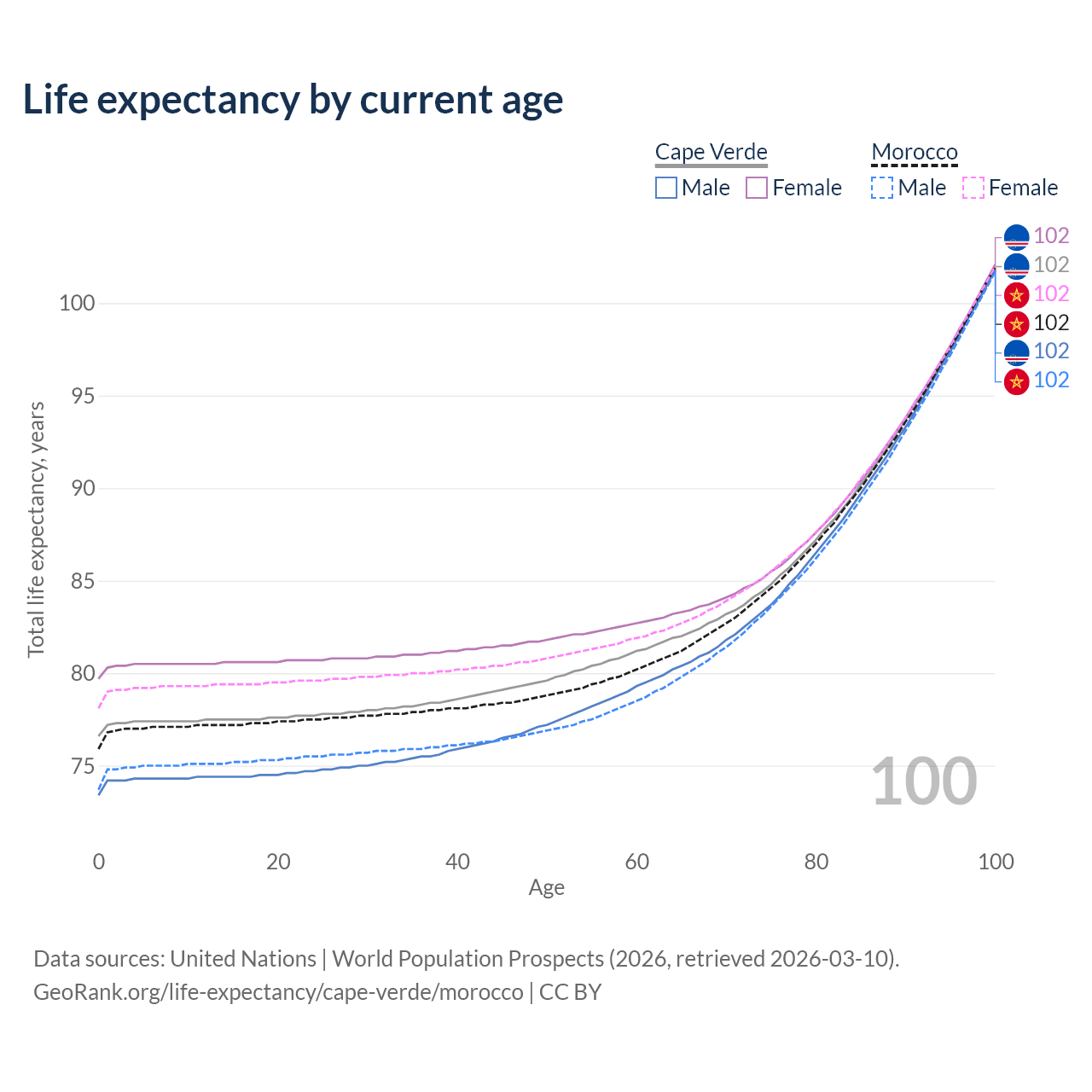 This life expectancy calculator shows the odds of living to 100, 95, 90, and below based on current age for both males and females in Cape Verde and Morocco, along with mean and median age of death. The calculations are based on the 2026 life tables (actuarial tables) from the UN World Population Prospects.