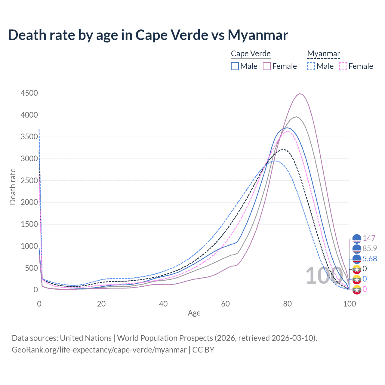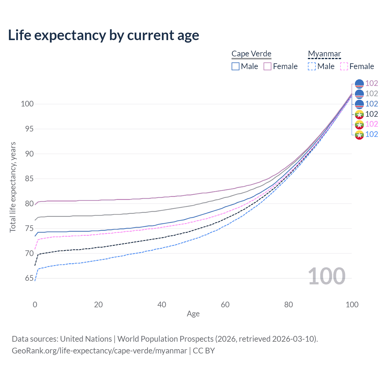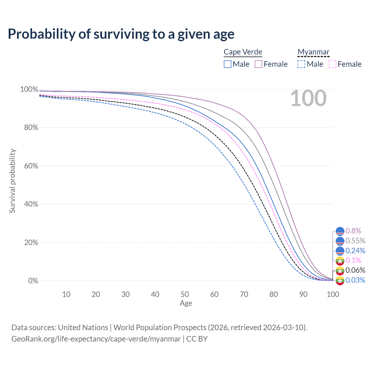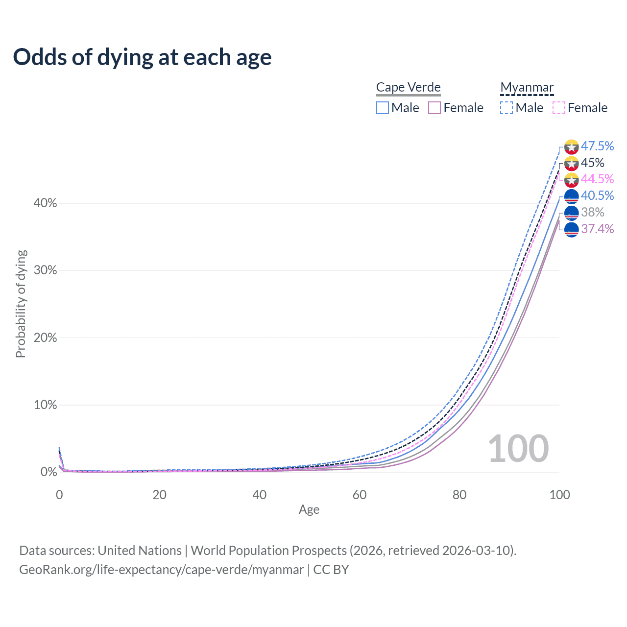 This life expectancy calculator shows the odds of living to 100, 95, 90, and below based on current age for both males and females in Cape Verde and Myanmar, along with mean and median age of death. The calculations are based on the 2026 life tables (actuarial tables) from the UN World Population Prospects.
