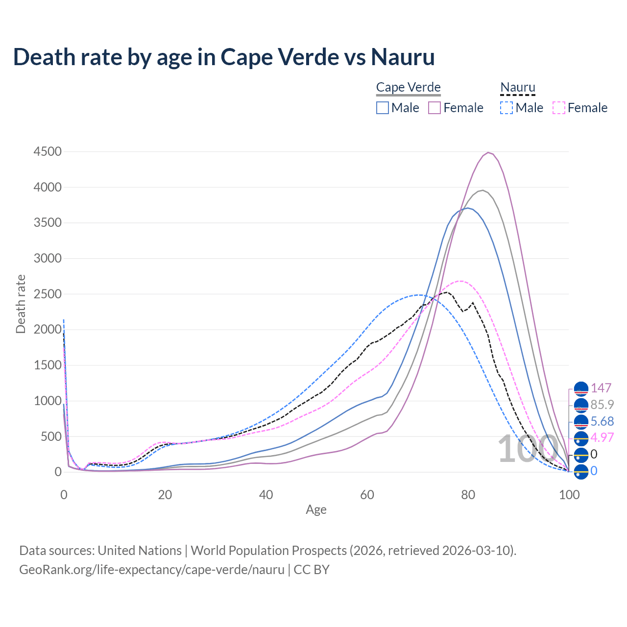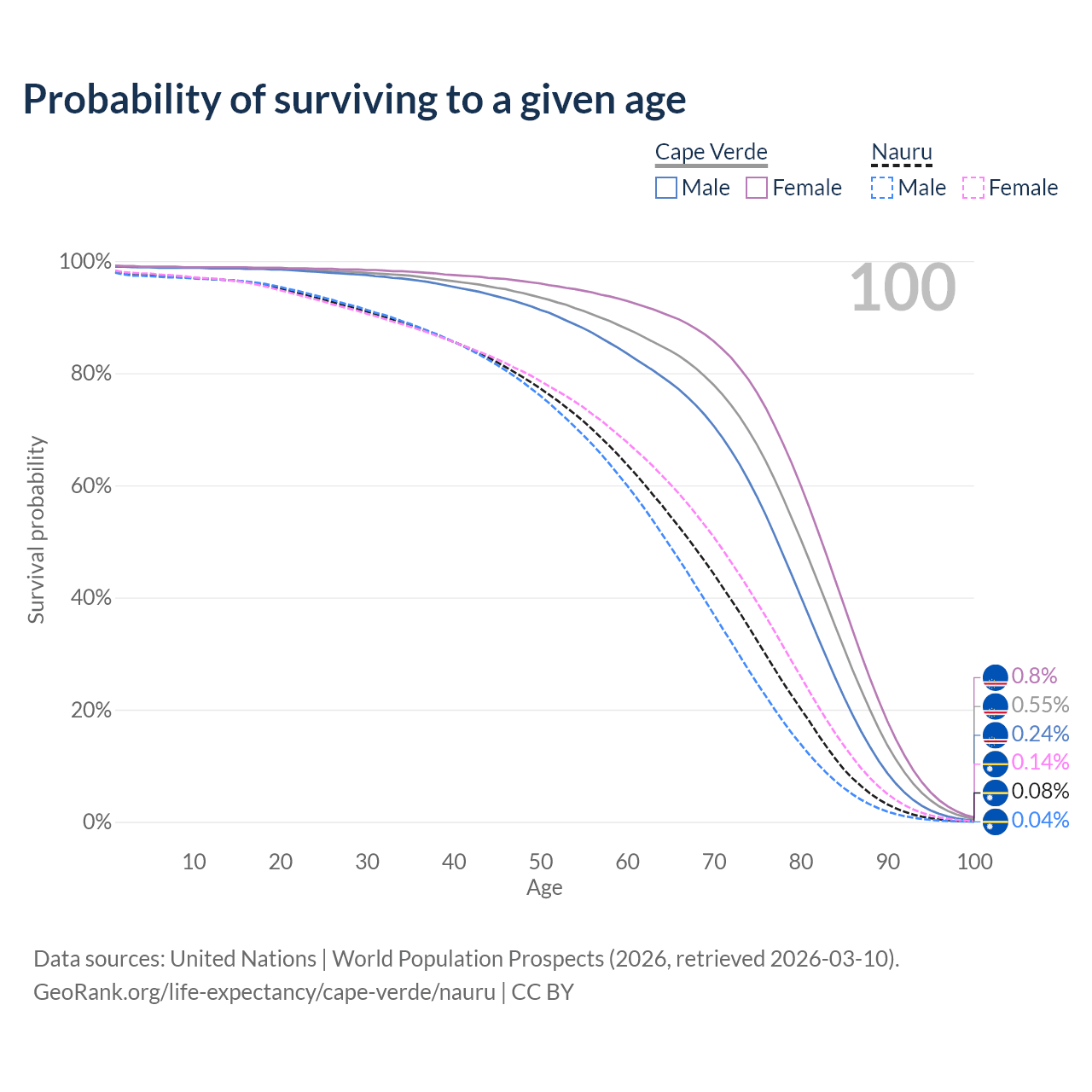 This life expectancy calculator shows the odds of living to 100, 95, 90, and below based on current age for both males and females in Cape Verde and Nauru, along with mean and median age of death. The calculations are based on the 2026 life tables (actuarial tables) from the UN World Population Prospects.