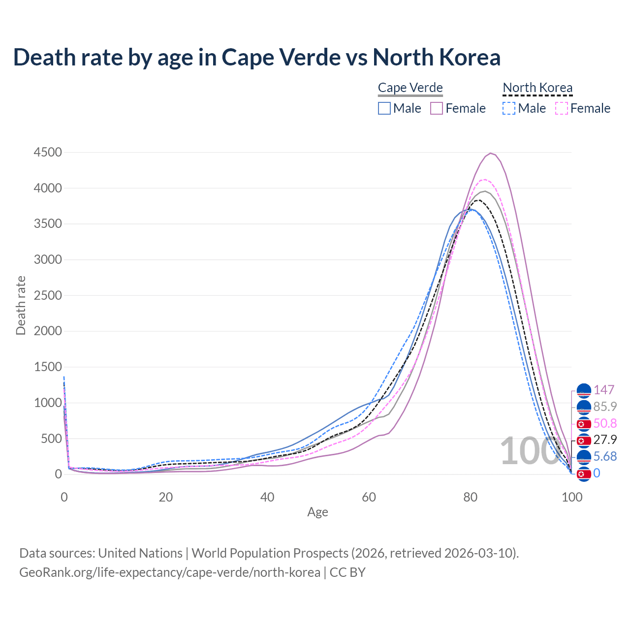 In Cape Verde, the most common age of death is 83, compared to 82 in North Korea. The median age of death is 80.1 in Cape Verde and 78.5 in North Korea, meaning only half of each cohort is expected to live past that age.