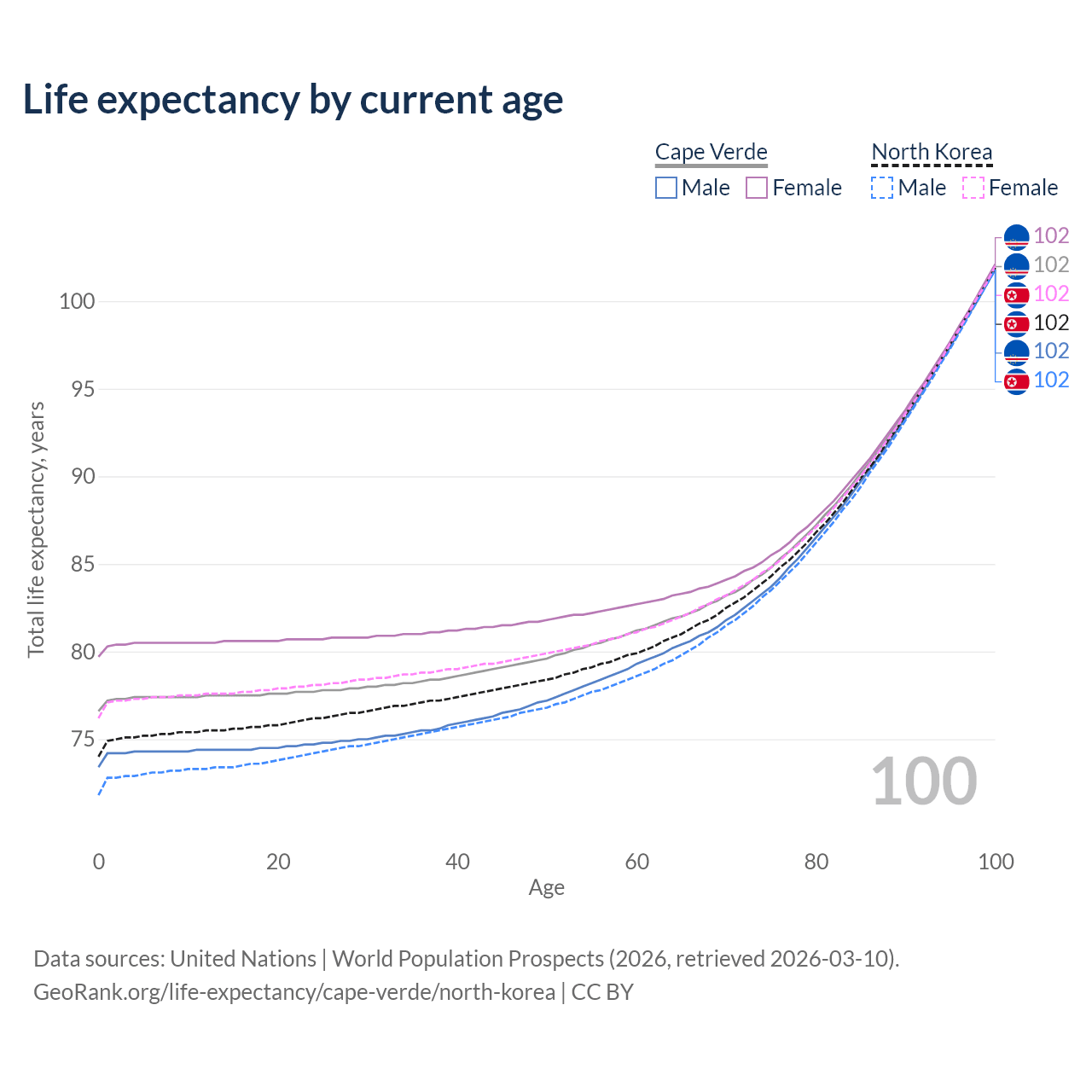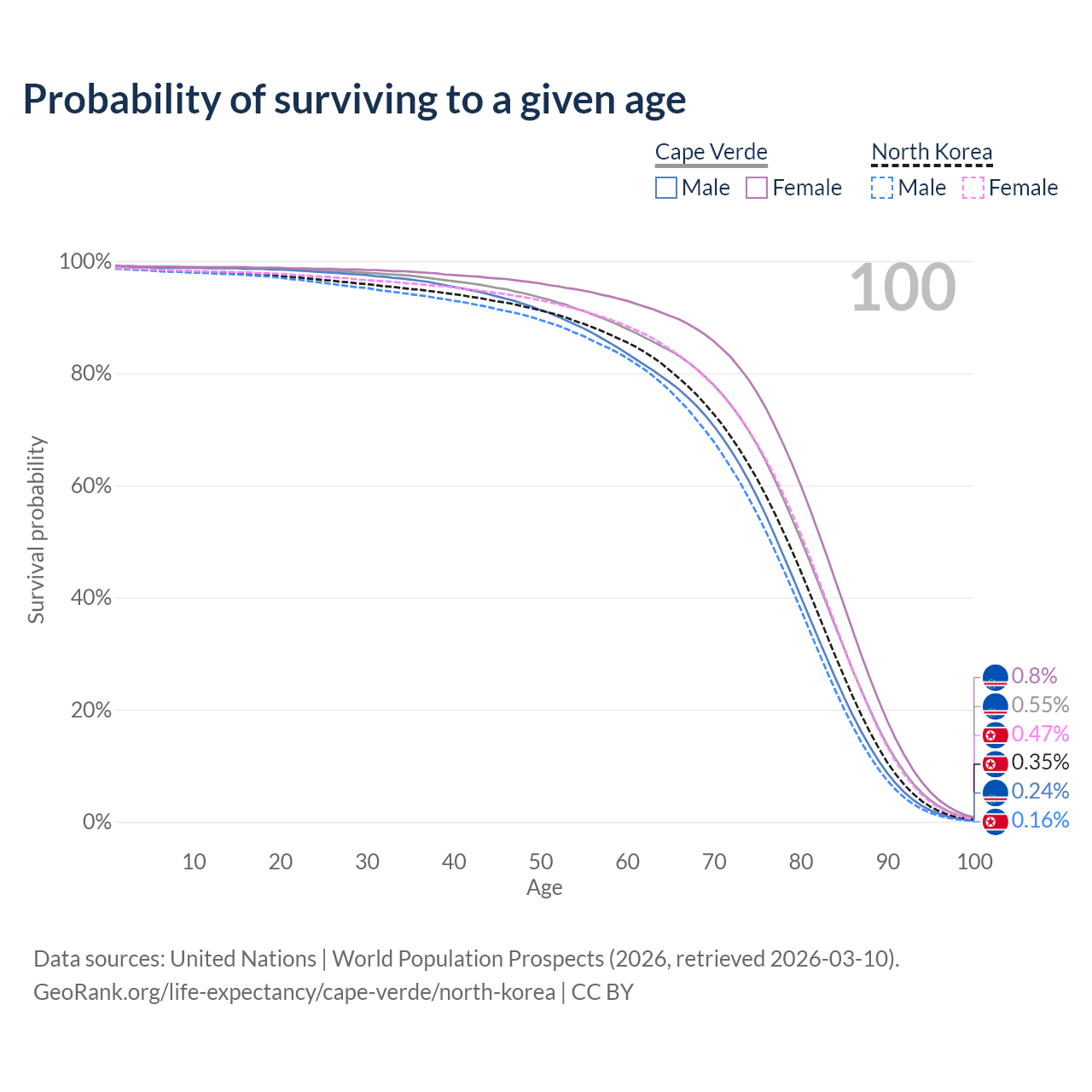 This life expectancy calculator shows the odds of living to 100, 95, 90, and below based on current age for both males and females in Cape Verde and North Korea, along with mean and median age of death. The calculations are based on the 2026 life tables (actuarial tables) from the UN World Population Prospects.