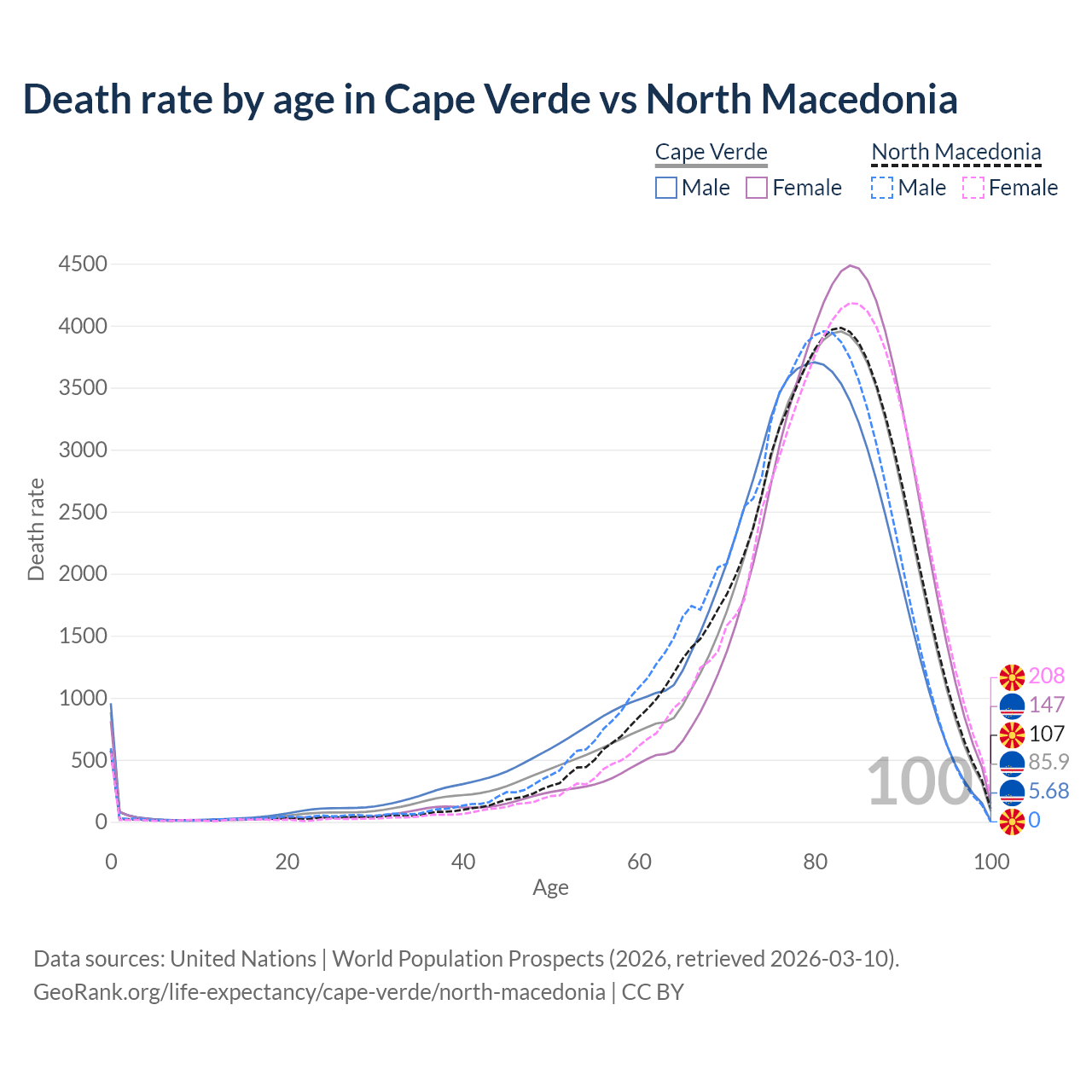 In Cape Verde, the most common age of death is 83, compared to 83 in North Macedonia. The median age of death is 80.1 in Cape Verde and 80.3 in North Macedonia, meaning only half of each cohort is expected to live past that age.