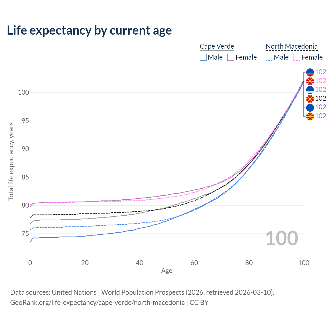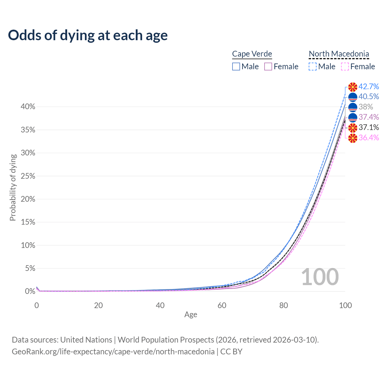 This life expectancy calculator shows the odds of living to 100, 95, 90, and below based on current age for both males and females in Cape Verde and North Macedonia, along with mean and median age of death. The calculations are based on the 2026 life tables (actuarial tables) from the UN World Population Prospects.