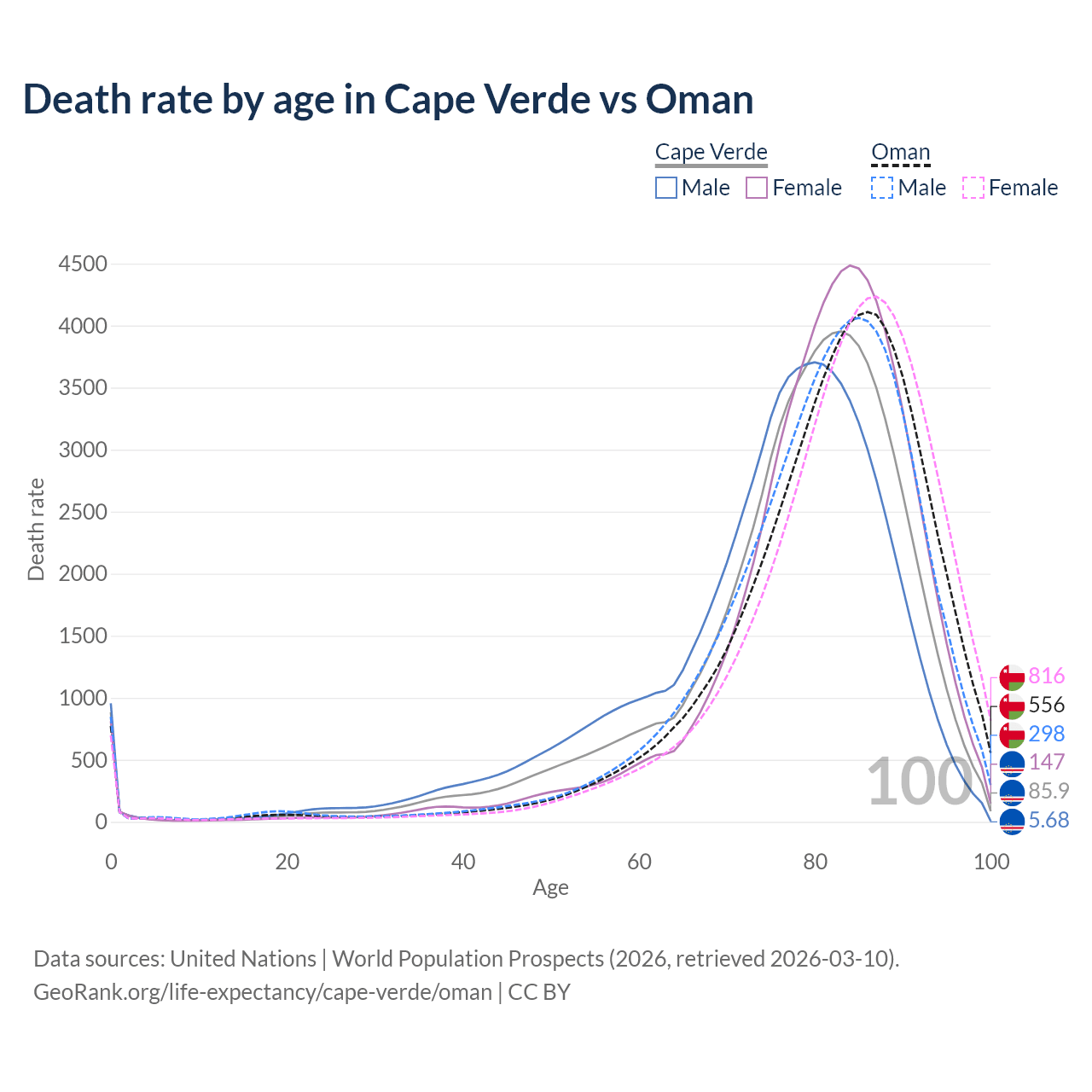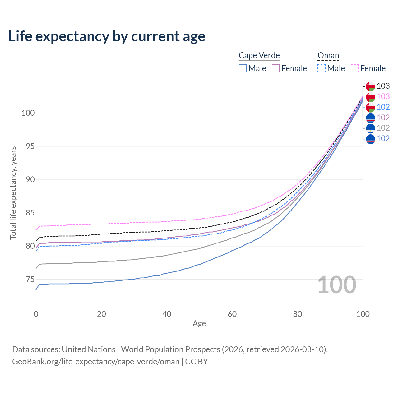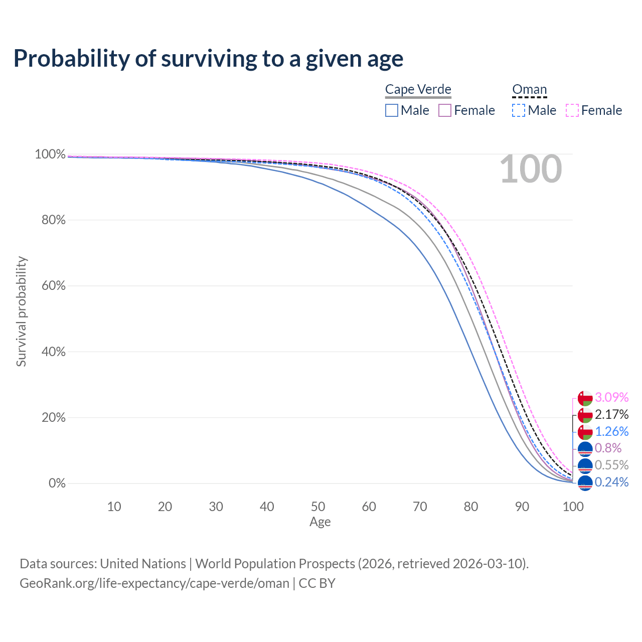 This life expectancy calculator shows the odds of living to 100, 95, 90, and below based on current age for both males and females in Cape Verde and Oman, along with mean and median age of death. The calculations are based on the 2026 life tables (actuarial tables) from the UN World Population Prospects.