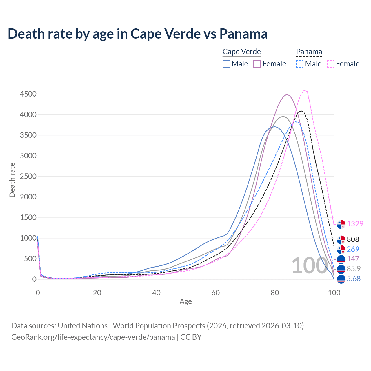 In Cape Verde, the most common age of death is 83, compared to 89 in Panama. The median age of death is 80.1 in Cape Verde and 84.6 in Panama, meaning only half of each cohort is expected to live past that age.