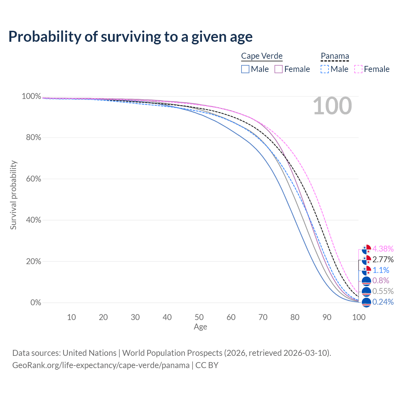 This life expectancy calculator shows the odds of living to 100, 95, 90, and below based on current age for both males and females in Cape Verde and Panama, along with mean and median age of death. The calculations are based on the 2026 life tables (actuarial tables) from the UN World Population Prospects.