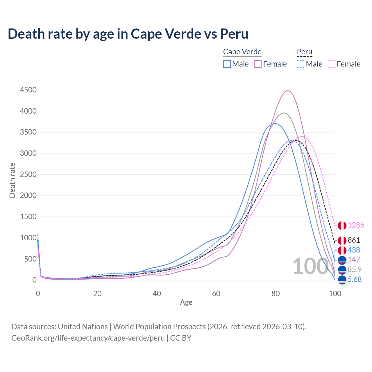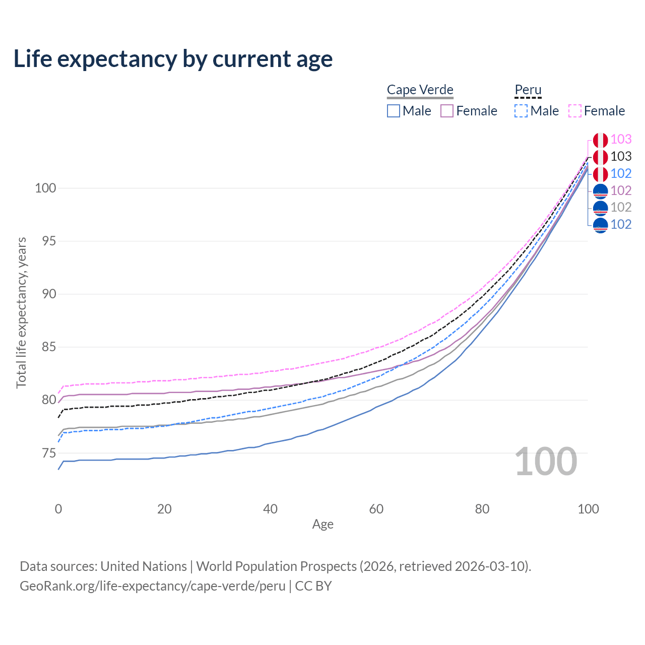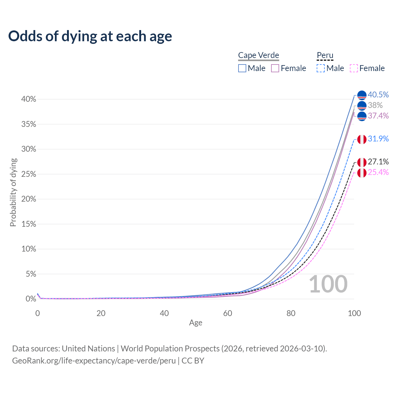 This life expectancy calculator shows the odds of living to 100, 95, 90, and below based on current age for both males and females in Cape Verde and Peru, along with mean and median age of death. The calculations are based on the 2026 life tables (actuarial tables) from the UN World Population Prospects.