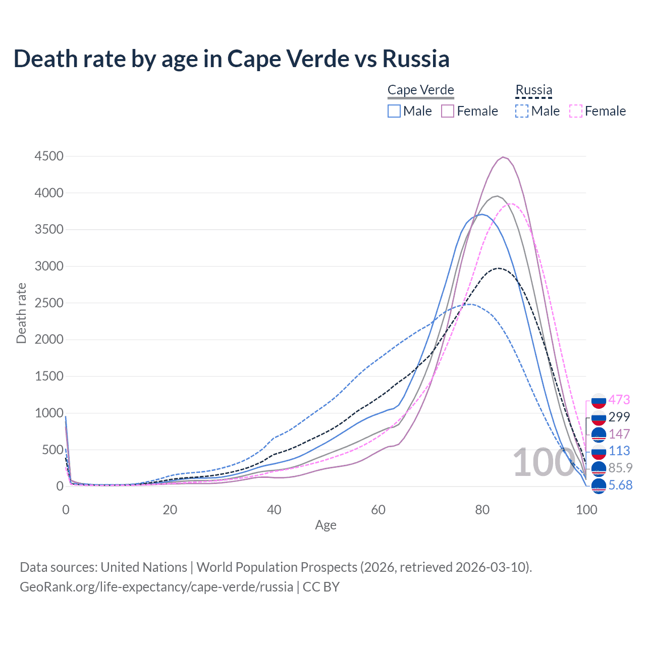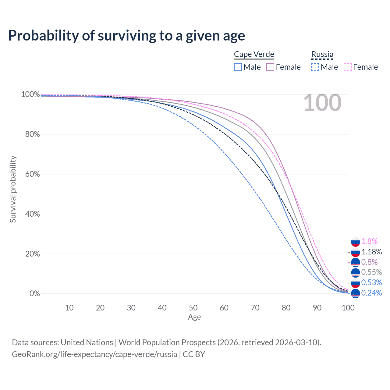 This life expectancy calculator shows the odds of living to 100, 95, 90, and below based on current age for both males and females in Cape Verde and Russia, along with mean and median age of death. The calculations are based on the 2026 life tables (actuarial tables) from the UN World Population Prospects.