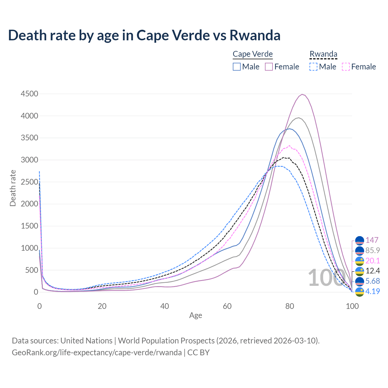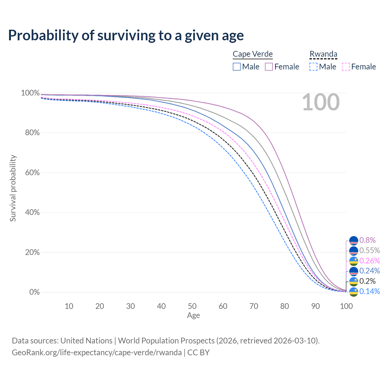 This life expectancy calculator shows the odds of living to 100, 95, 90, and below based on current age for both males and females in Cape Verde and Rwanda, along with mean and median age of death. The calculations are based on the 2026 life tables (actuarial tables) from the UN World Population Prospects.