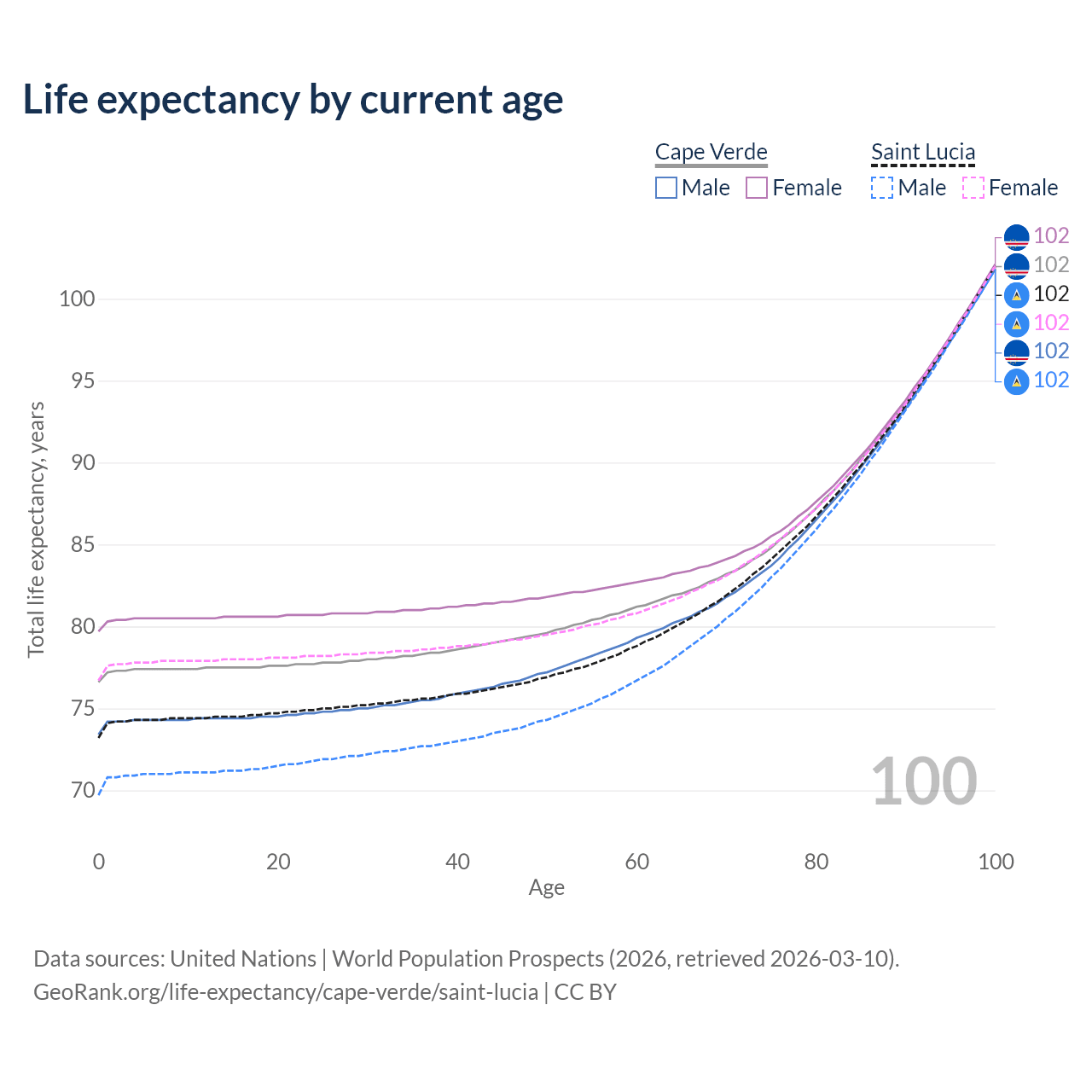 This life expectancy calculator shows the odds of living to 100, 95, 90, and below based on current age for both males and females in Cape Verde and Saint Lucia, along with mean and median age of death. The calculations are based on the 2026 life tables (actuarial tables) from the UN World Population Prospects.