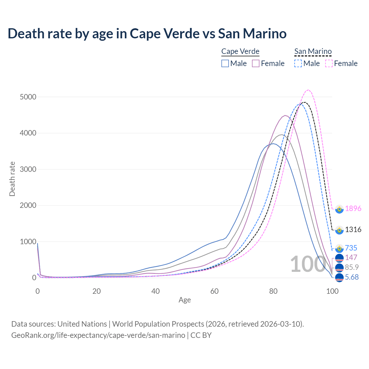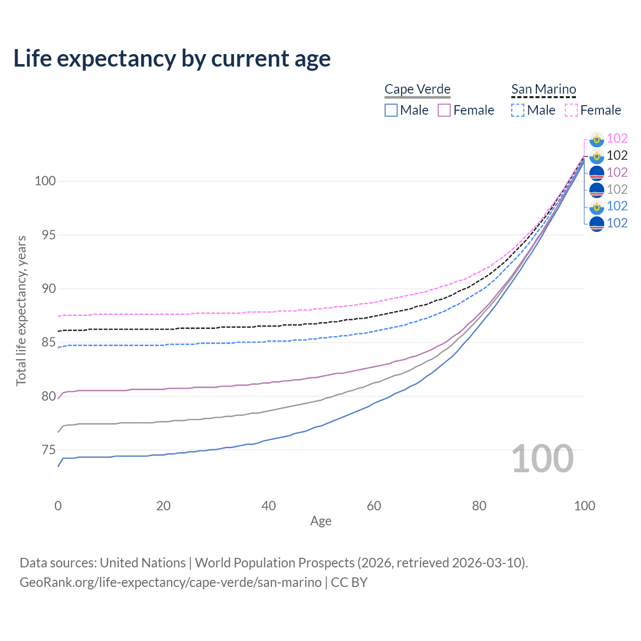 This life expectancy calculator shows the odds of living to 100, 95, 90, and below based on current age for both males and females in Cape Verde and San Marino, along with mean and median age of death. The calculations are based on the 2026 life tables (actuarial tables) from the UN World Population Prospects.