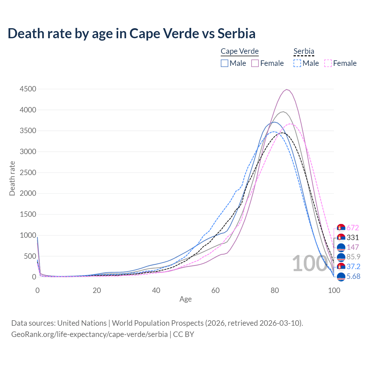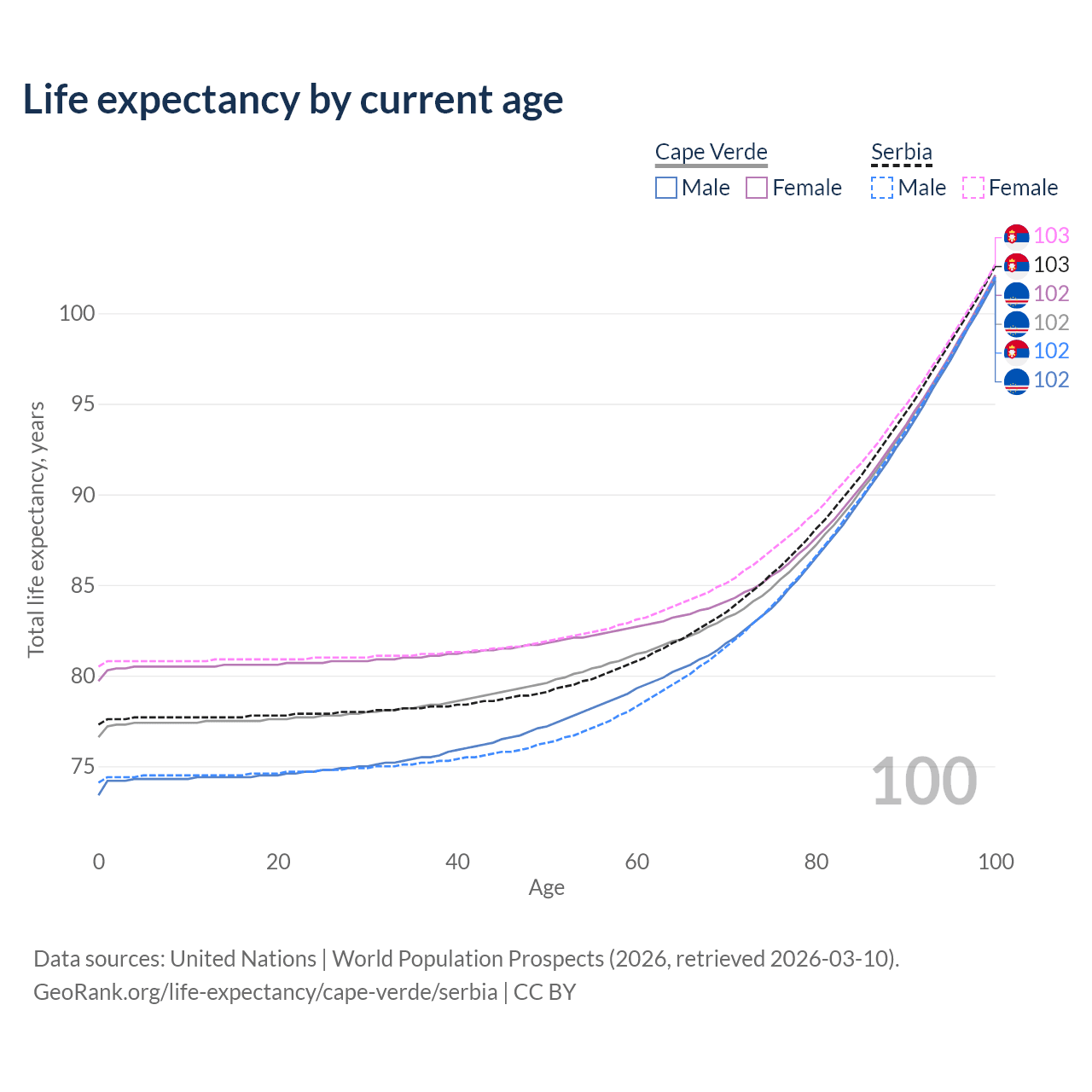 This life expectancy calculator shows the odds of living to 100, 95, 90, and below based on current age for both males and females in Cape Verde and Serbia, along with mean and median age of death. The calculations are based on the 2026 life tables (actuarial tables) from the UN World Population Prospects.