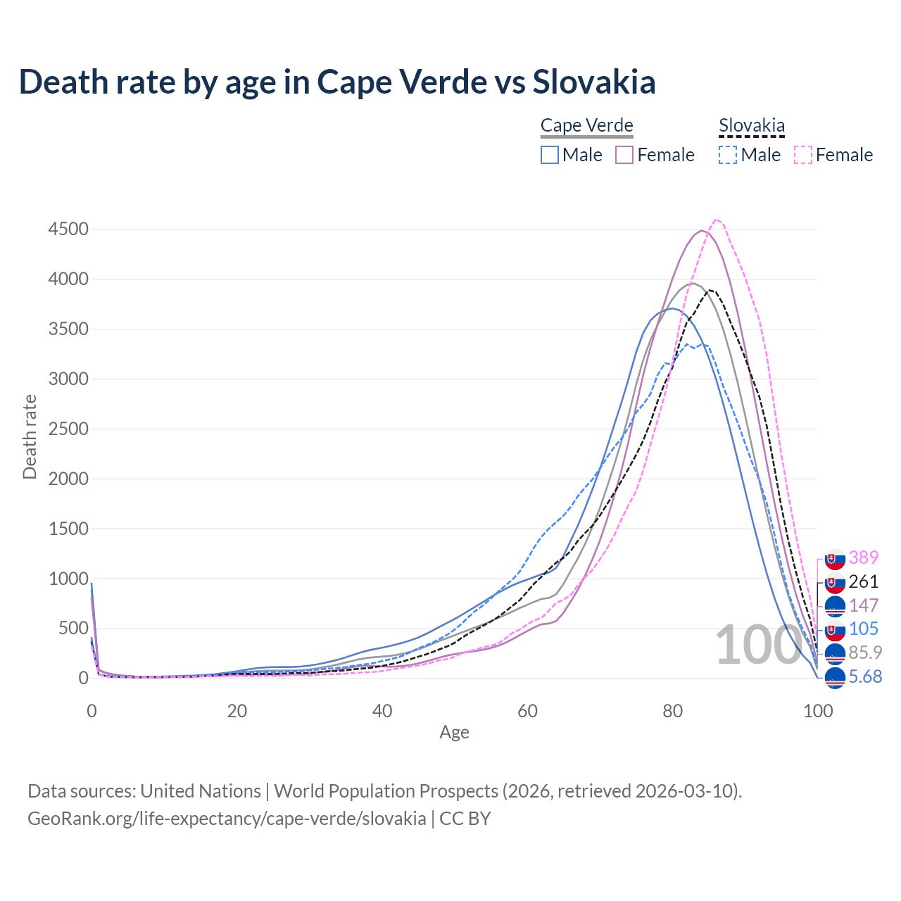 In Cape Verde, the most common age of death is 83, compared to 85 in Slovakia. The median age of death is 80.1 in Cape Verde and 82 in Slovakia, meaning only half of each cohort is expected to live past that age.