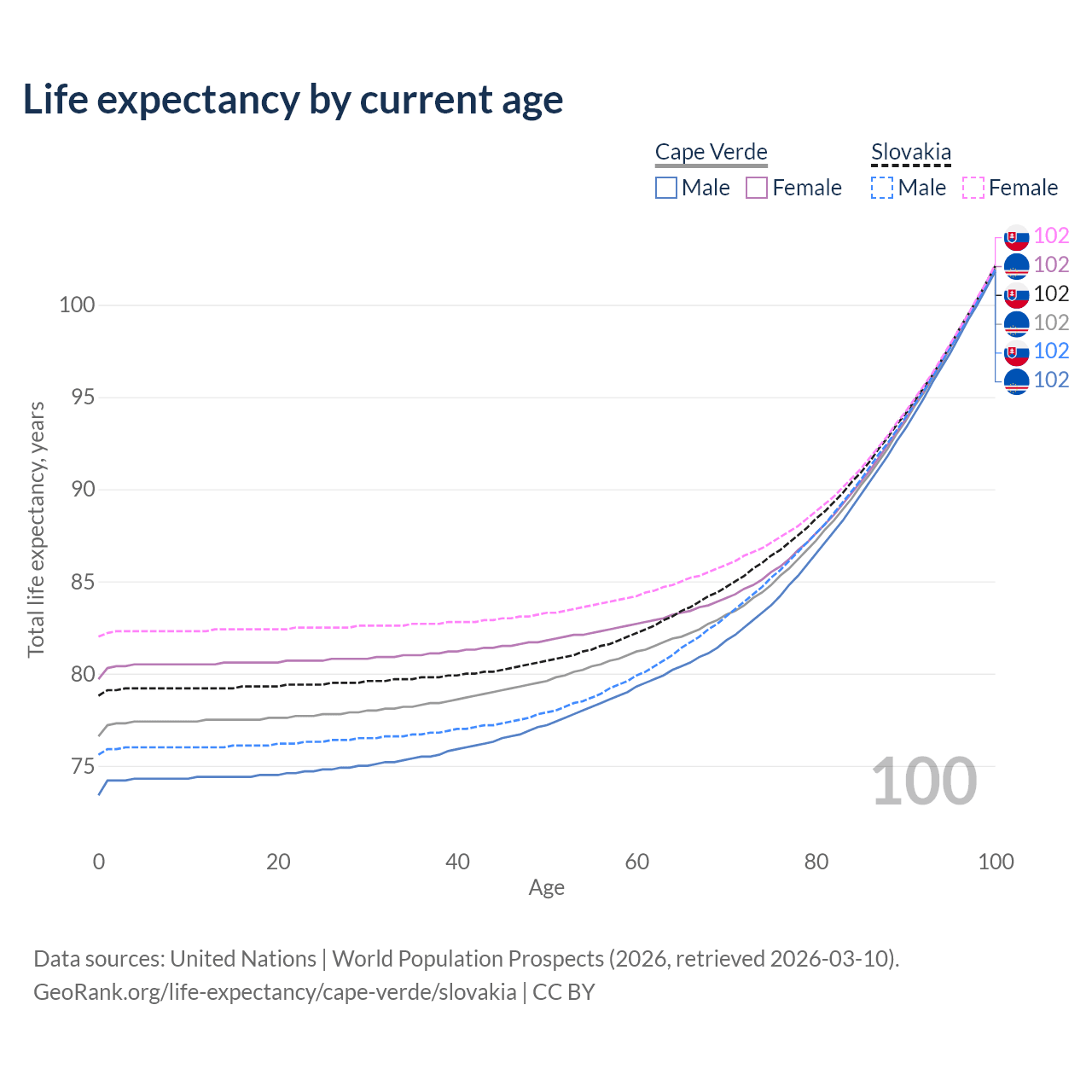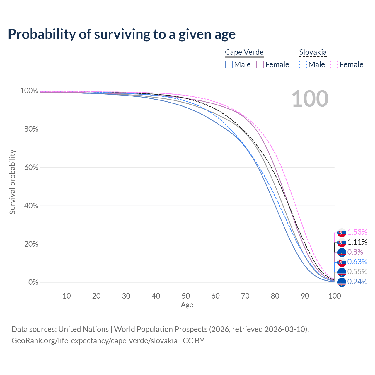 This life expectancy calculator shows the odds of living to 100, 95, 90, and below based on current age for both males and females in Cape Verde and Slovakia, along with mean and median age of death. The calculations are based on the 2026 life tables (actuarial tables) from the UN World Population Prospects.