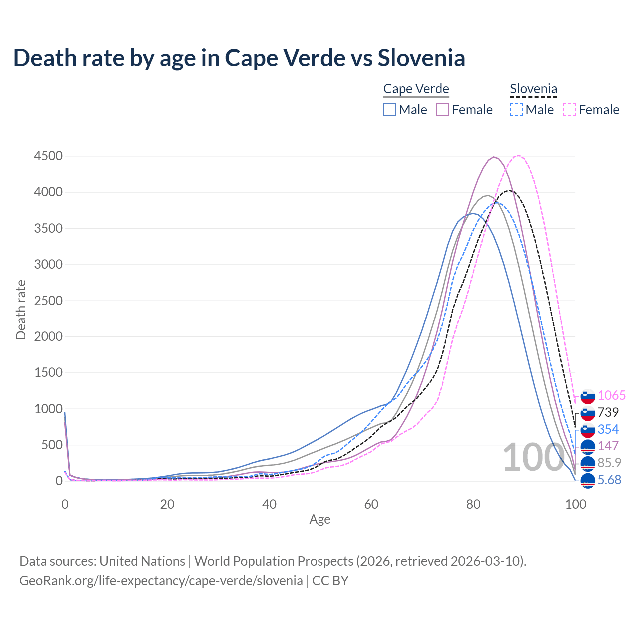 In Cape Verde, the most common age of death is 83, compared to 87 in Slovenia. The median age of death is 80.1 in Cape Verde and 84.4 in Slovenia, meaning only half of each cohort is expected to live past that age.