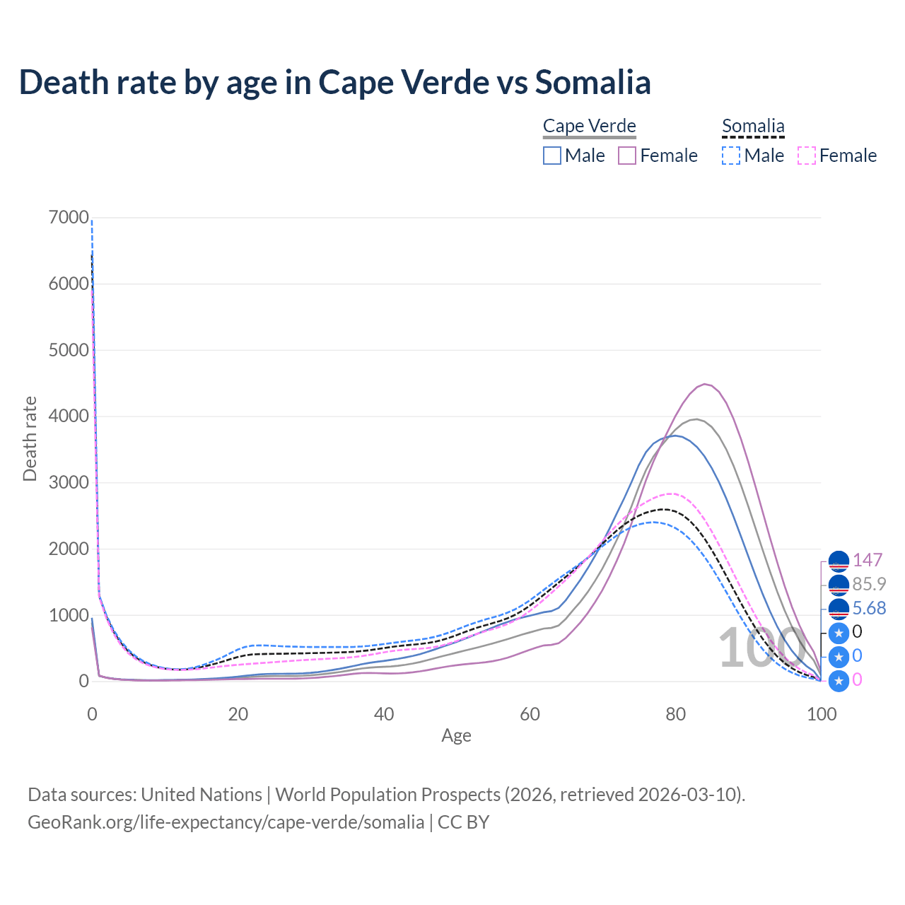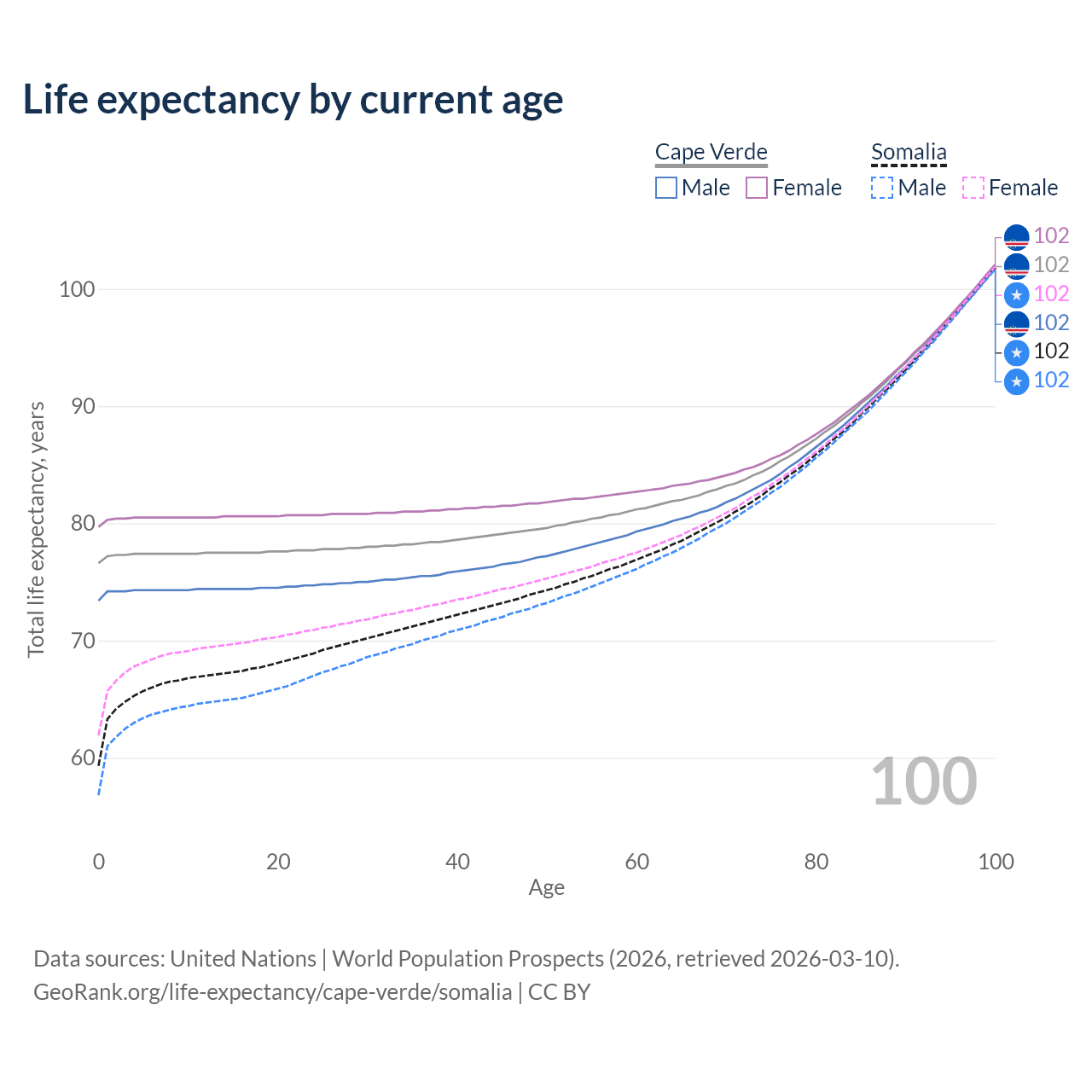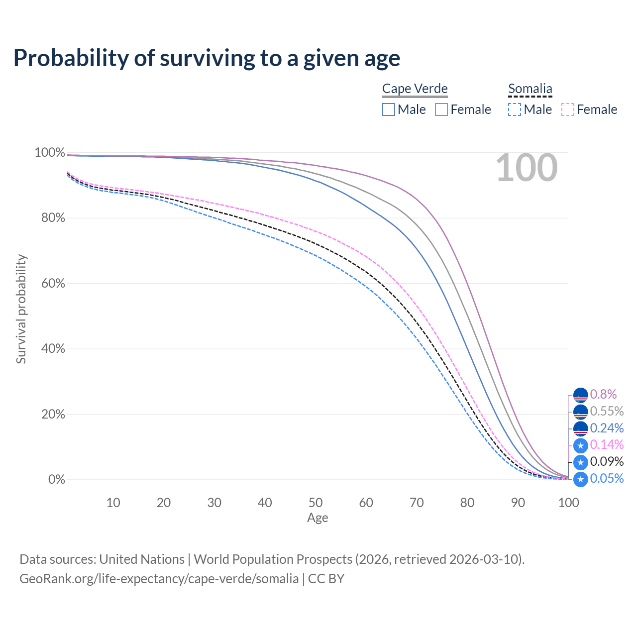 This life expectancy calculator shows the odds of living to 100, 95, 90, and below based on current age for both males and females in Cape Verde and Somalia, along with mean and median age of death. The calculations are based on the 2026 life tables (actuarial tables) from the UN World Population Prospects.