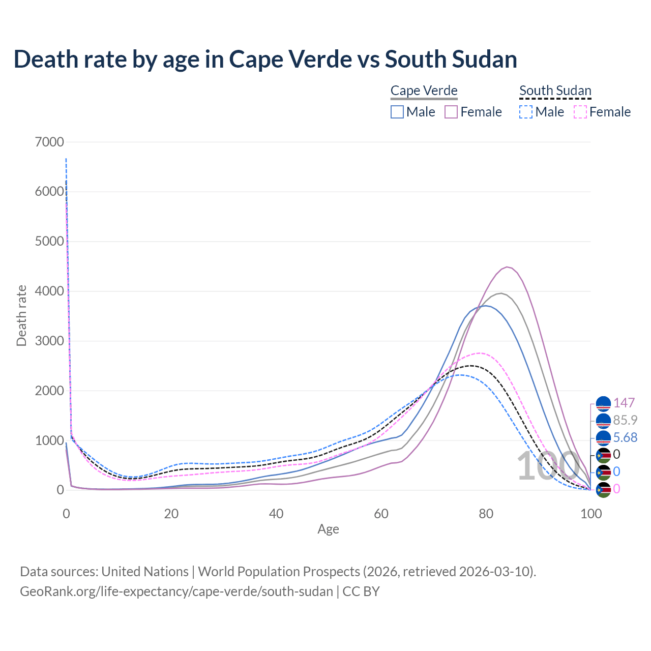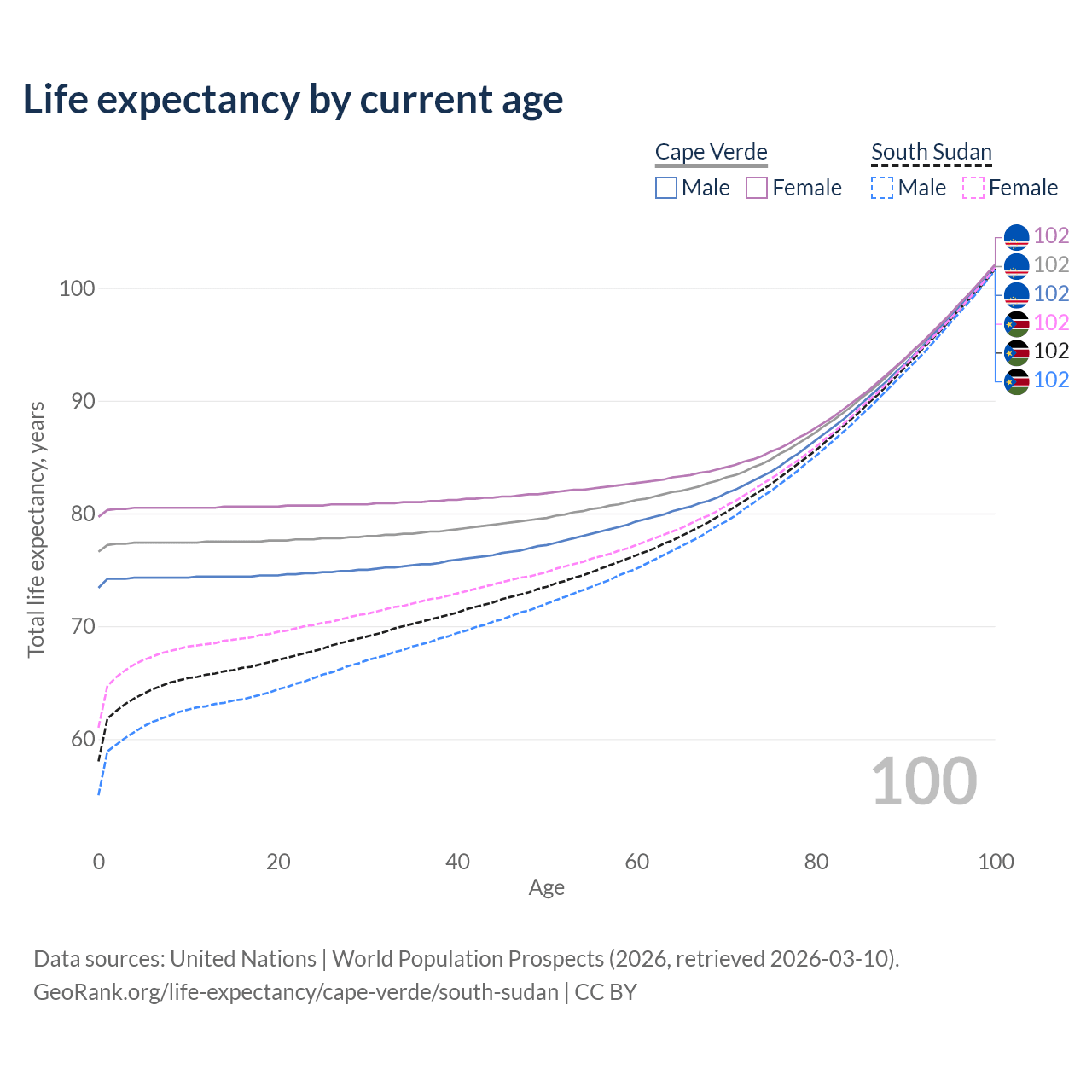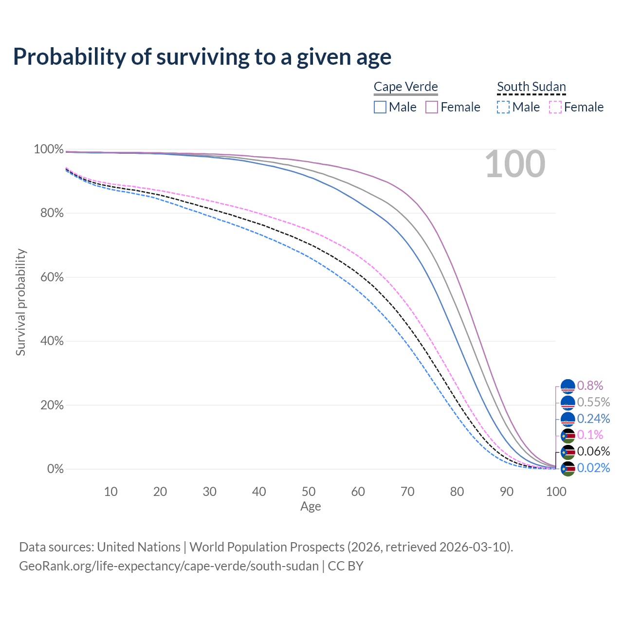 This life expectancy calculator shows the odds of living to 100, 95, 90, and below based on current age for both males and females in Cape Verde and South Sudan, along with mean and median age of death. The calculations are based on the 2026 life tables (actuarial tables) from the UN World Population Prospects.