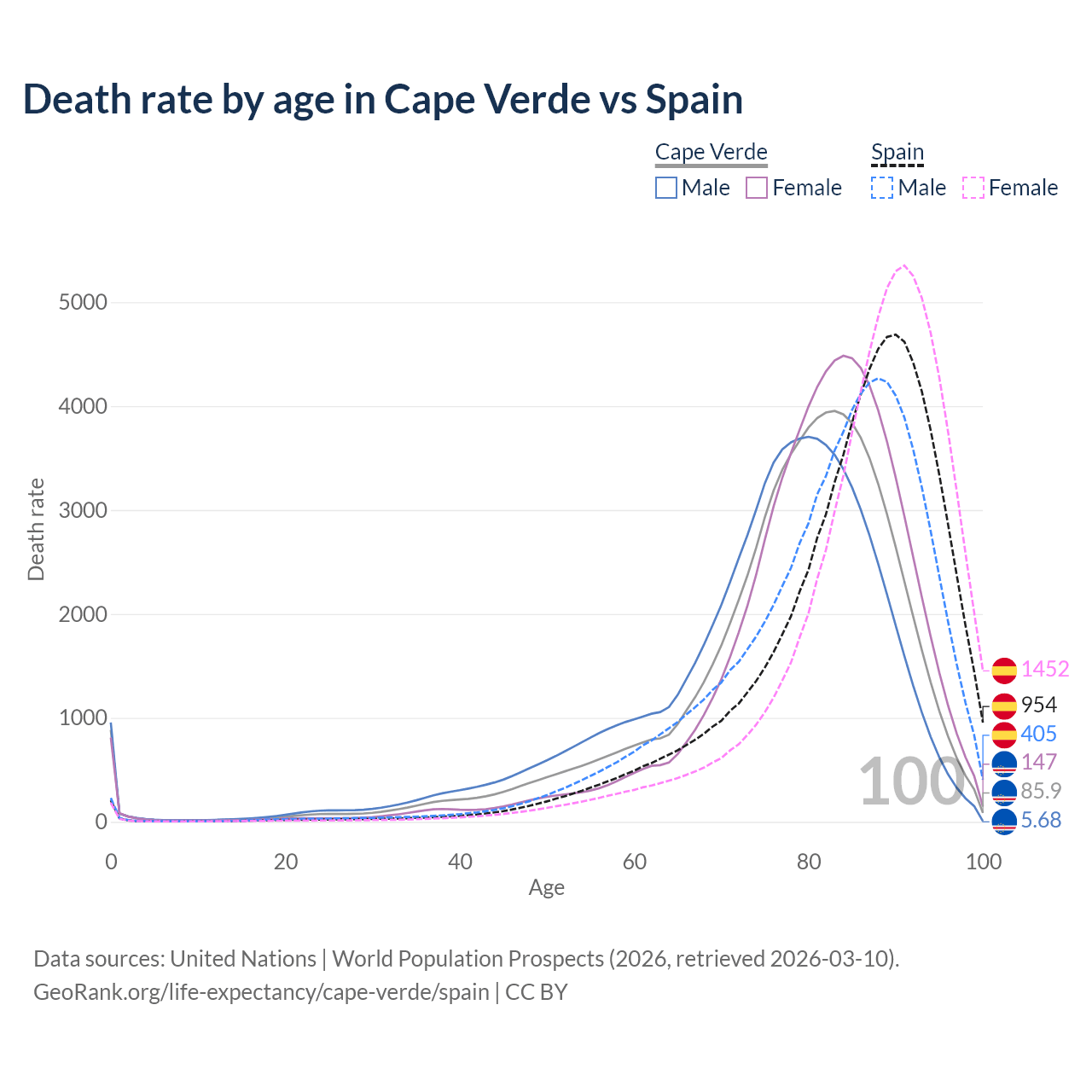 This life expectancy calculator shows the odds of living to 100, 95, 90, and below based on current age for both males and females in Cape Verde and Spain, along with mean and median age of death. The calculations are based on the 2026 life tables (actuarial tables) from the UN World Population Prospects.