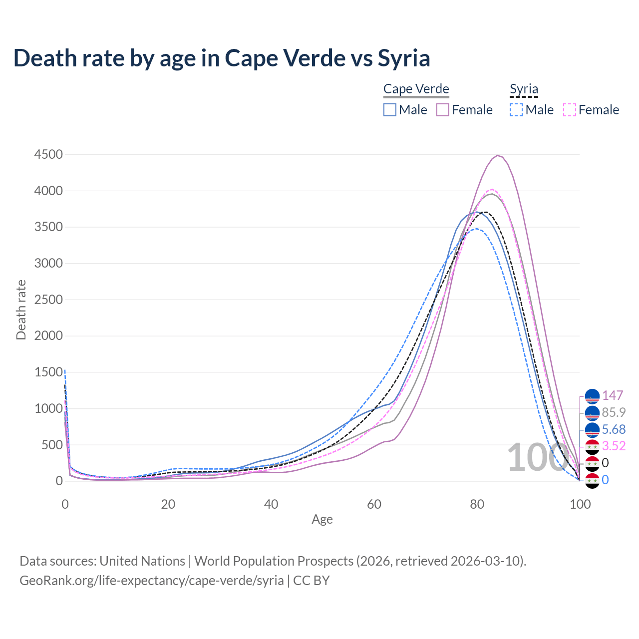 In Cape Verde, the most common age of death is 83, compared to 82 in Syria. The median age of death is 80.1 in Cape Verde and 77.7 in Syria, meaning only half of each cohort is expected to live past that age.
