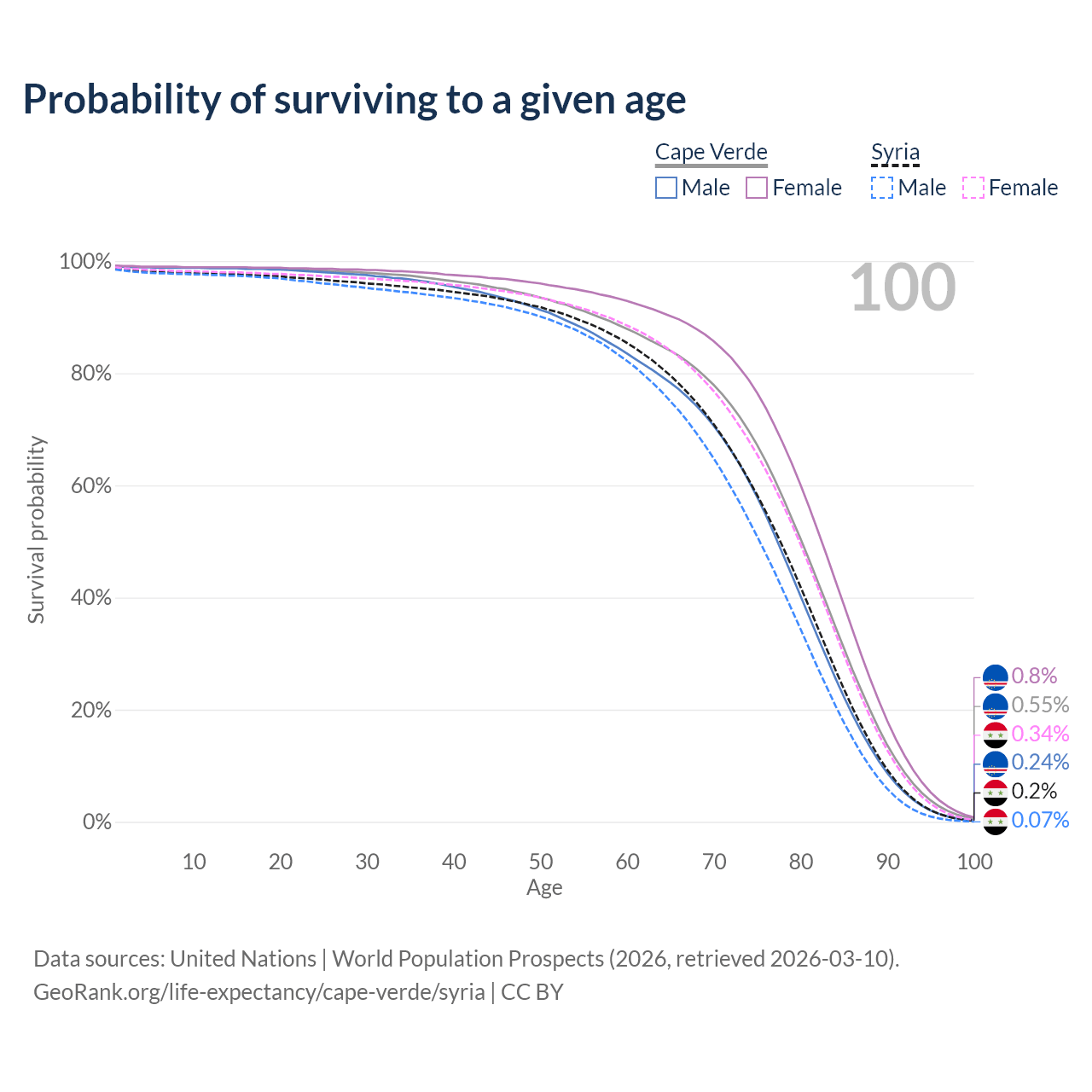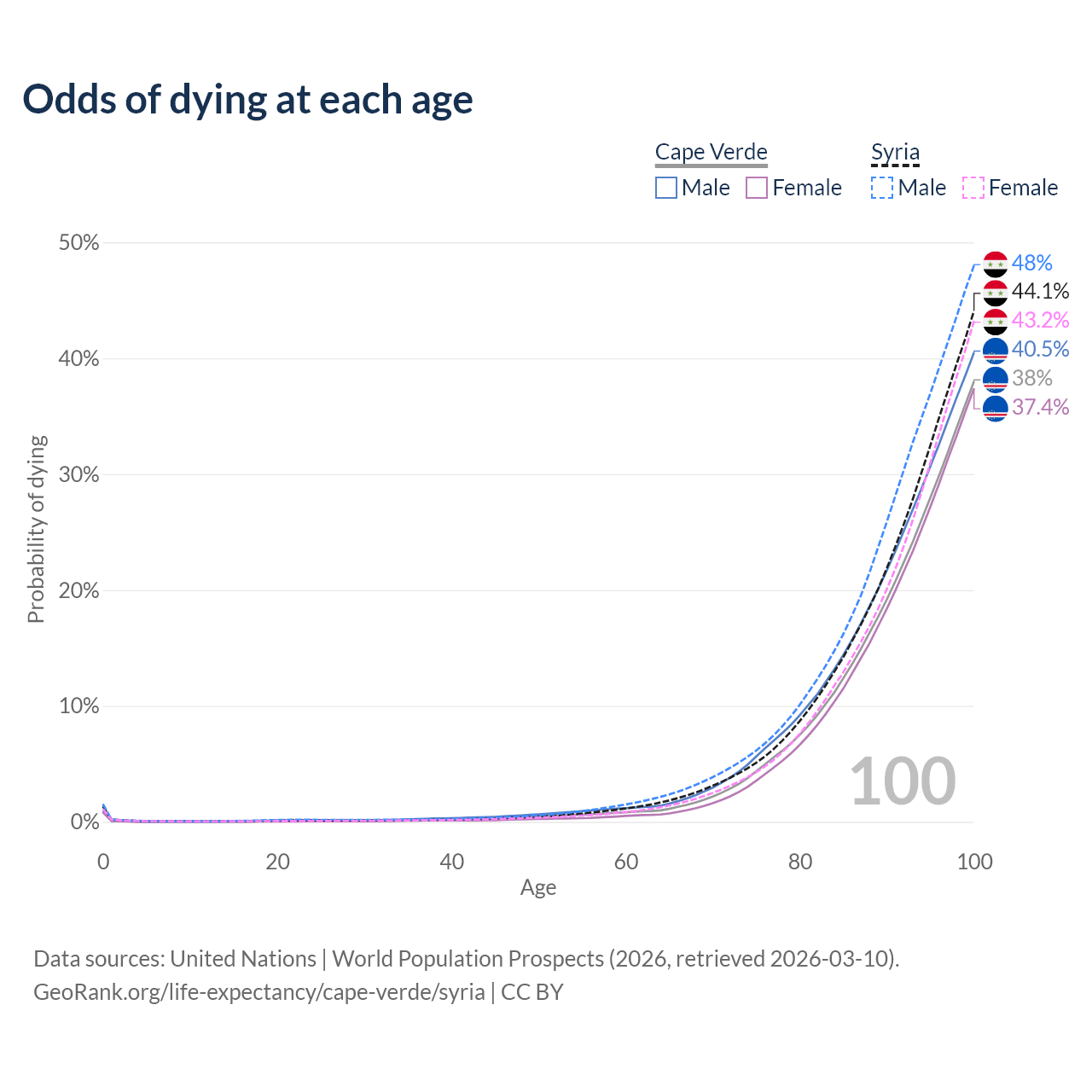This life expectancy calculator shows the odds of living to 100, 95, 90, and below based on current age for both males and females in Cape Verde and Syria, along with mean and median age of death. The calculations are based on the 2026 life tables (actuarial tables) from the UN World Population Prospects.
