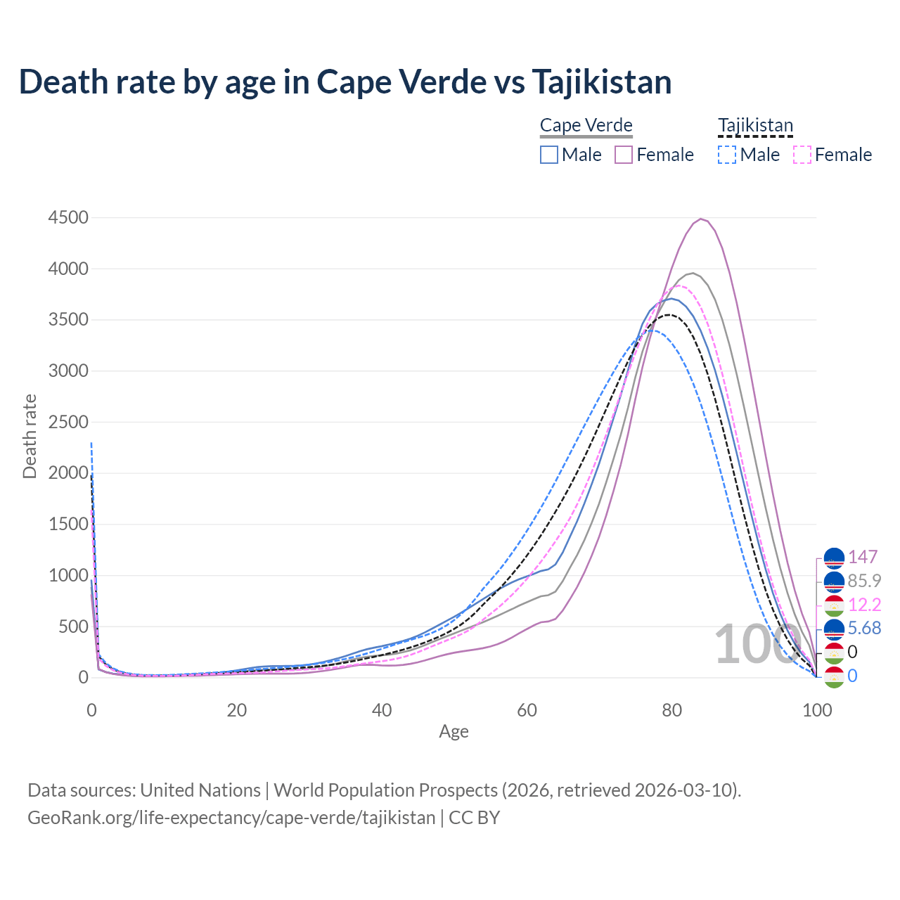 In Cape Verde, the most common age of death is 83, compared to 80 in Tajikistan. The median age of death is 80.1 in Cape Verde and 76 in Tajikistan, meaning only half of each cohort is expected to live past that age.