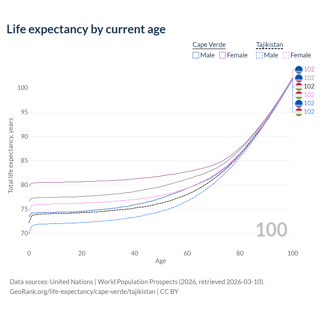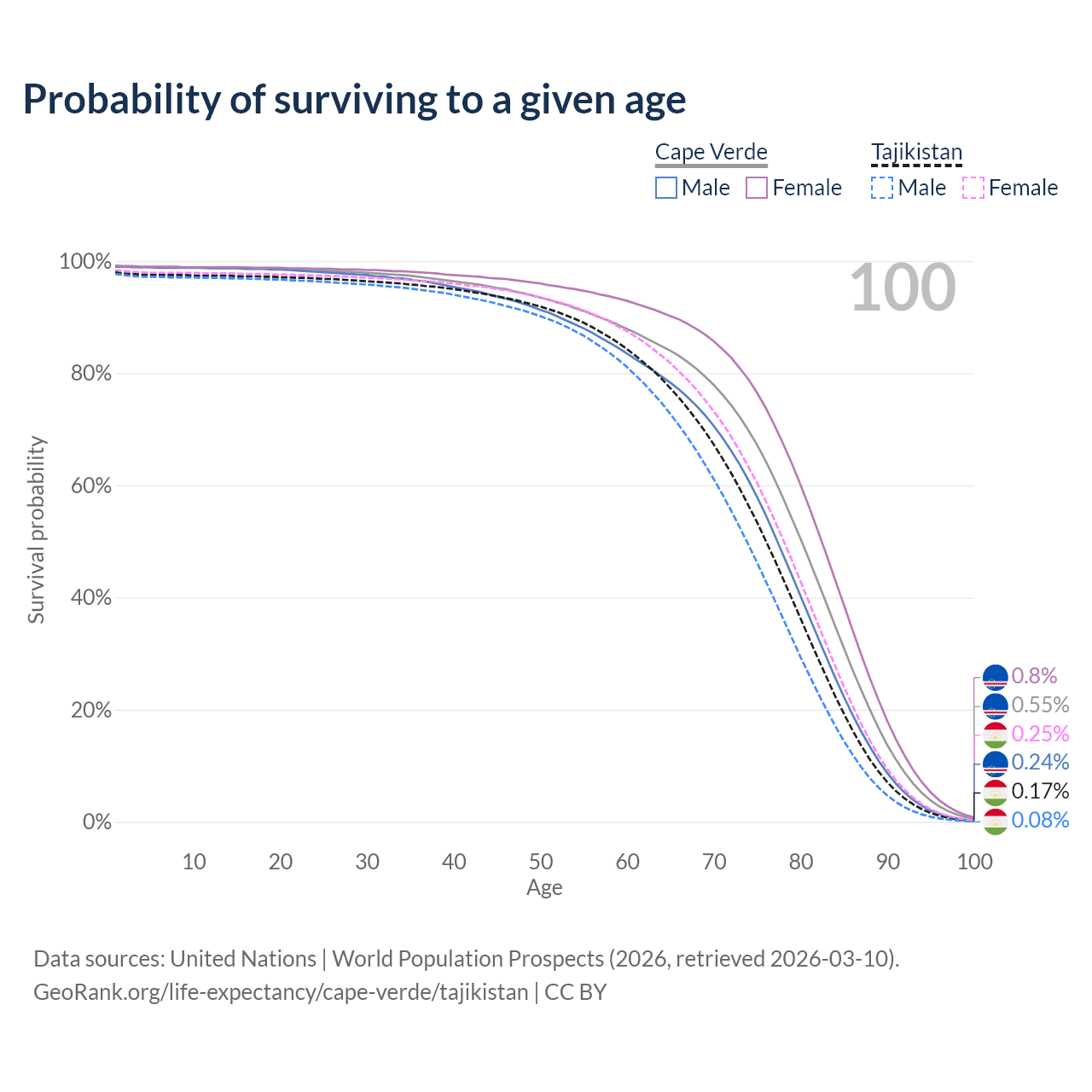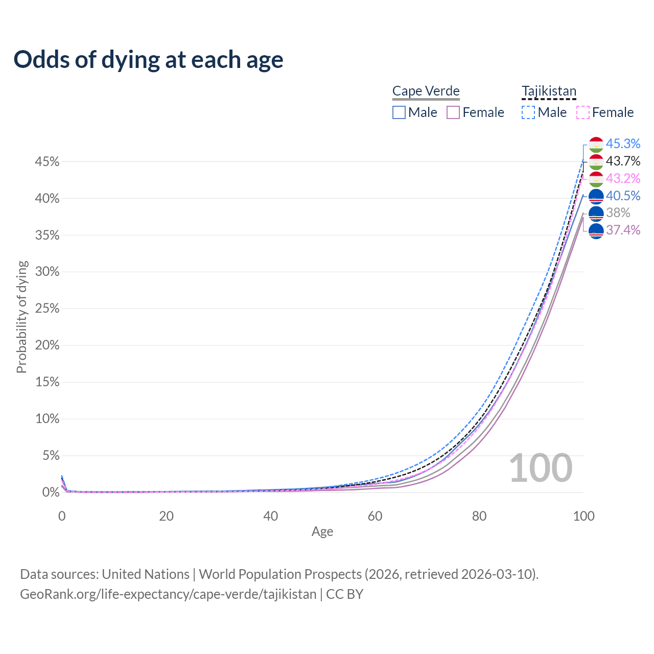 This life expectancy calculator shows the odds of living to 100, 95, 90, and below based on current age for both males and females in Cape Verde and Tajikistan, along with mean and median age of death. The calculations are based on the 2026 life tables (actuarial tables) from the UN World Population Prospects.