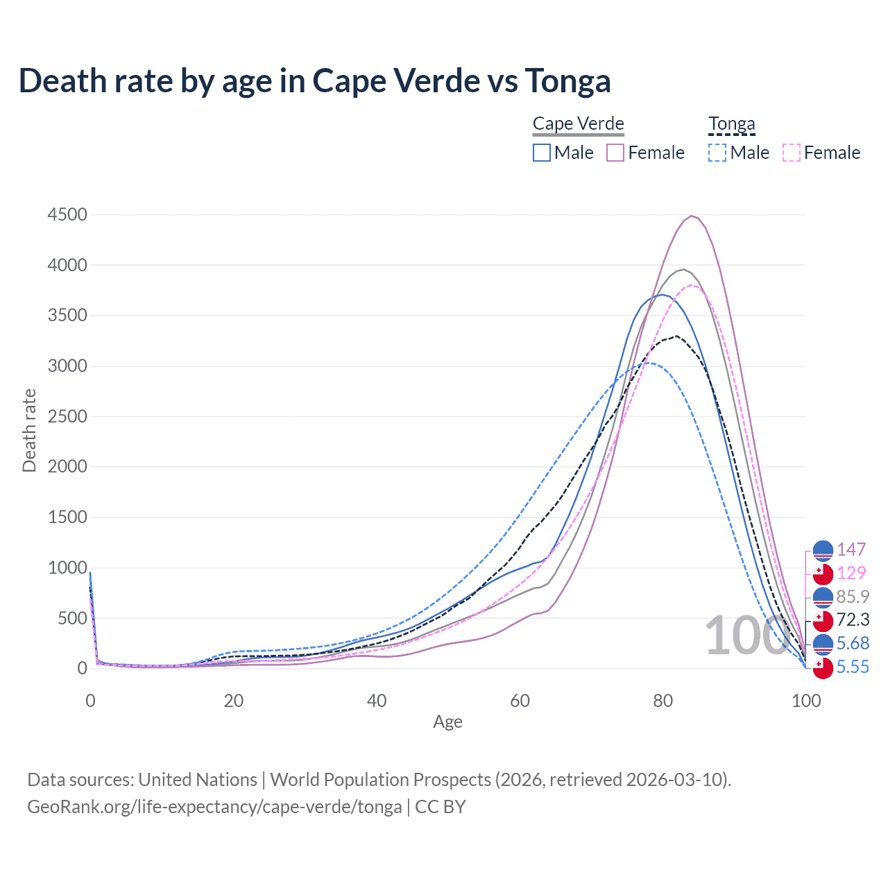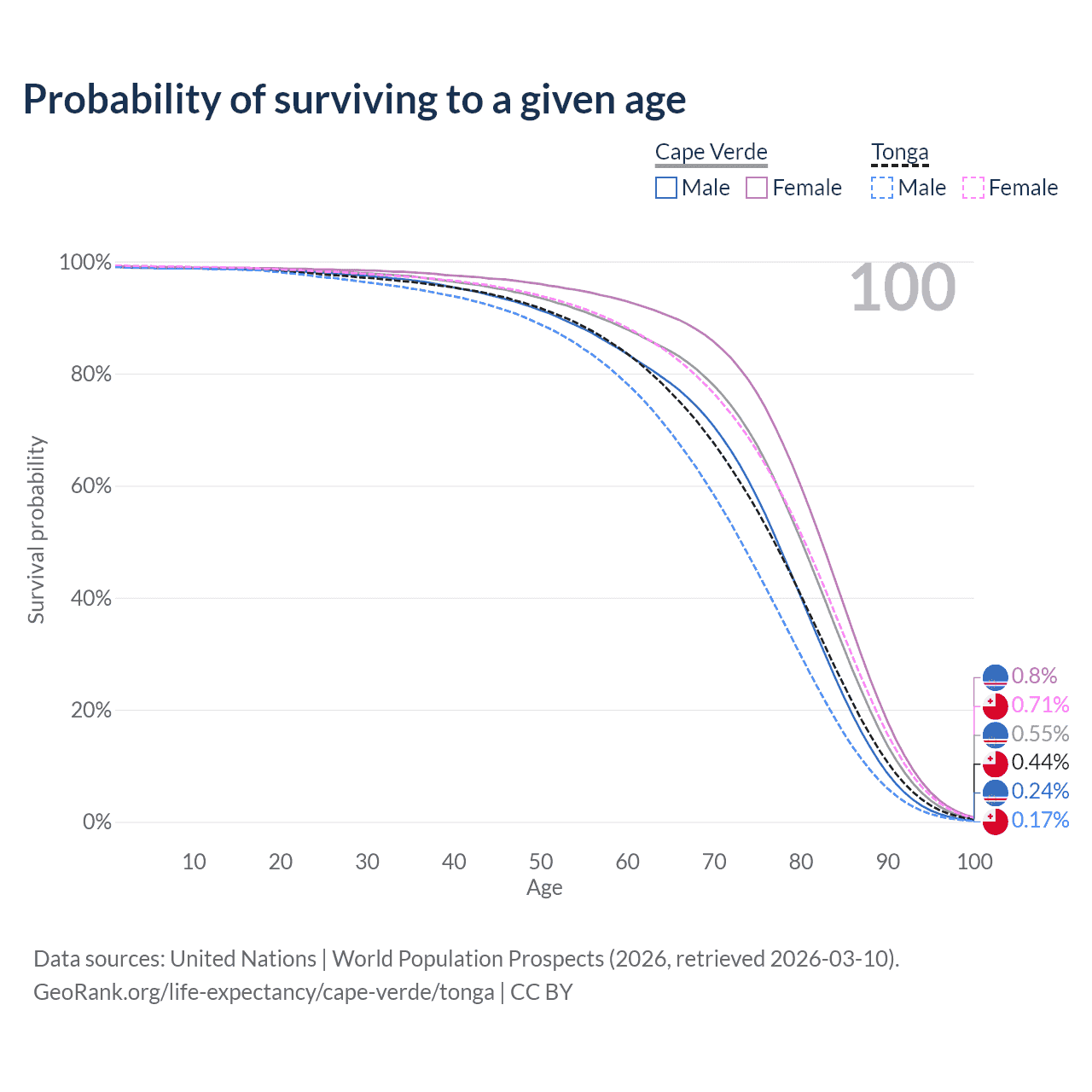 This life expectancy calculator shows the odds of living to 100, 95, 90, and below based on current age for both males and females in Cape Verde and Tonga, along with mean and median age of death. The calculations are based on the 2026 life tables (actuarial tables) from the UN World Population Prospects.