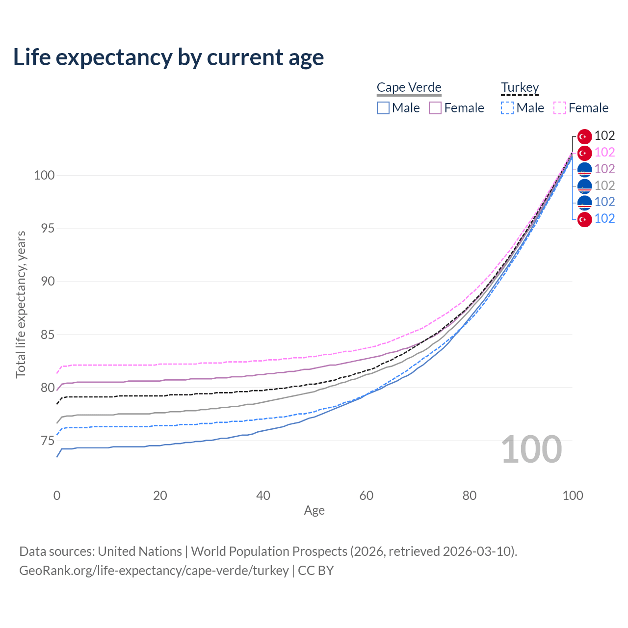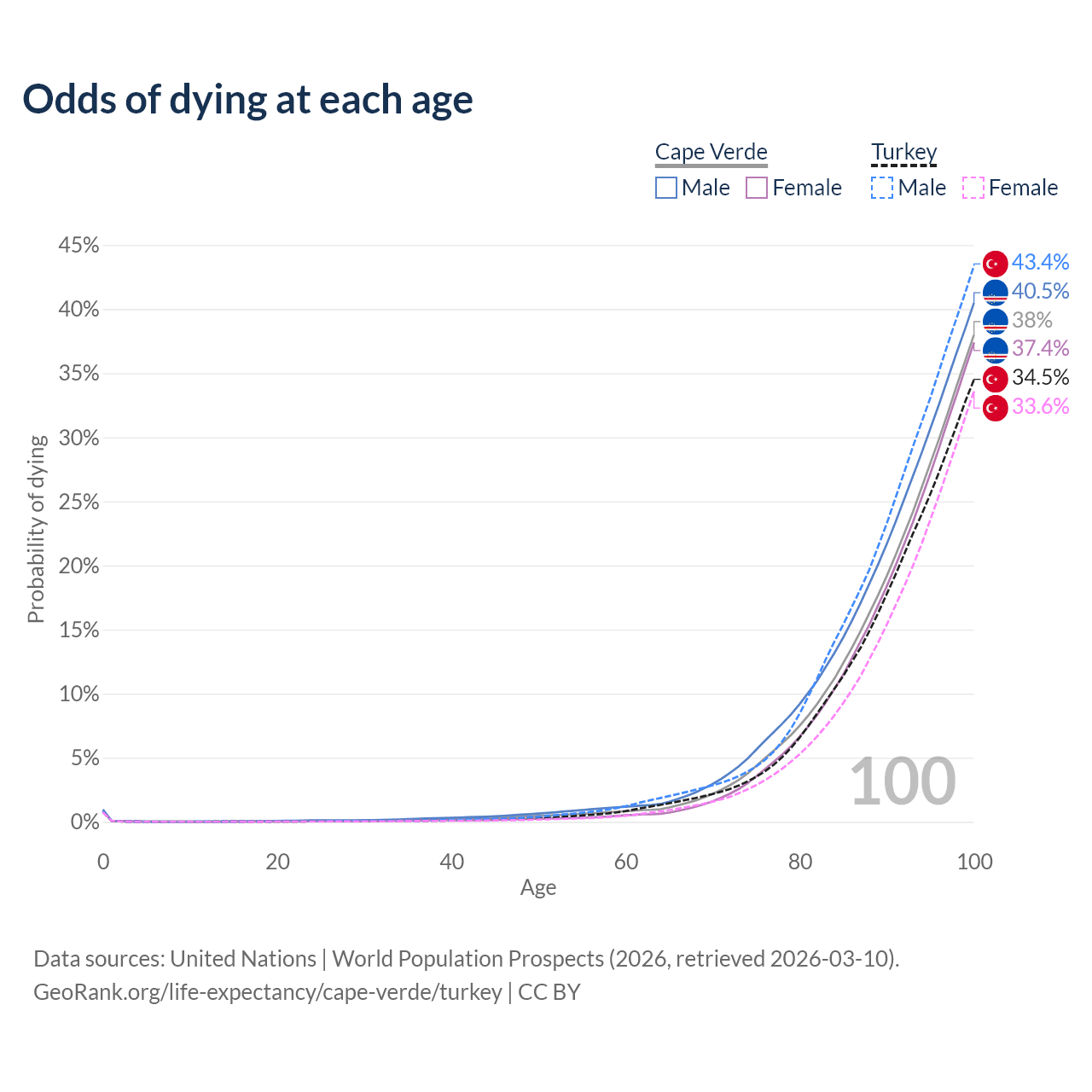 This life expectancy calculator shows the odds of living to 100, 95, 90, and below based on current age for both males and females in Cape Verde and Turkey, along with mean and median age of death. The calculations are based on the 2026 life tables (actuarial tables) from the UN World Population Prospects.