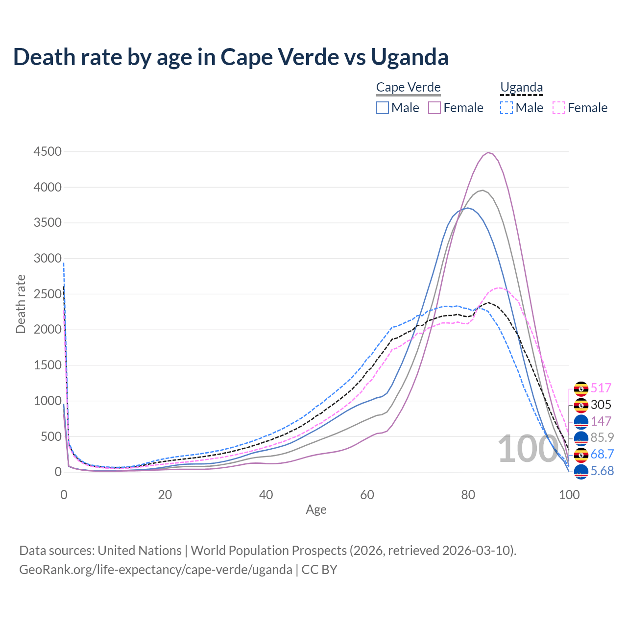 In Cape Verde, the most common age of death is 83, compared to 0 in Uganda. The median age of death is 80.1 in Cape Verde and 73.3 in Uganda, meaning only half of each cohort is expected to live past that age.