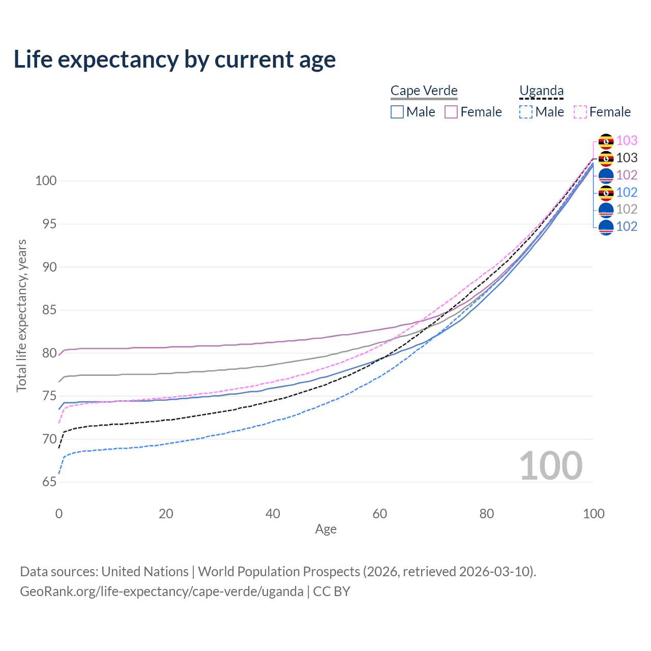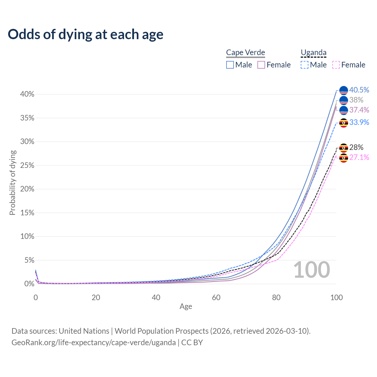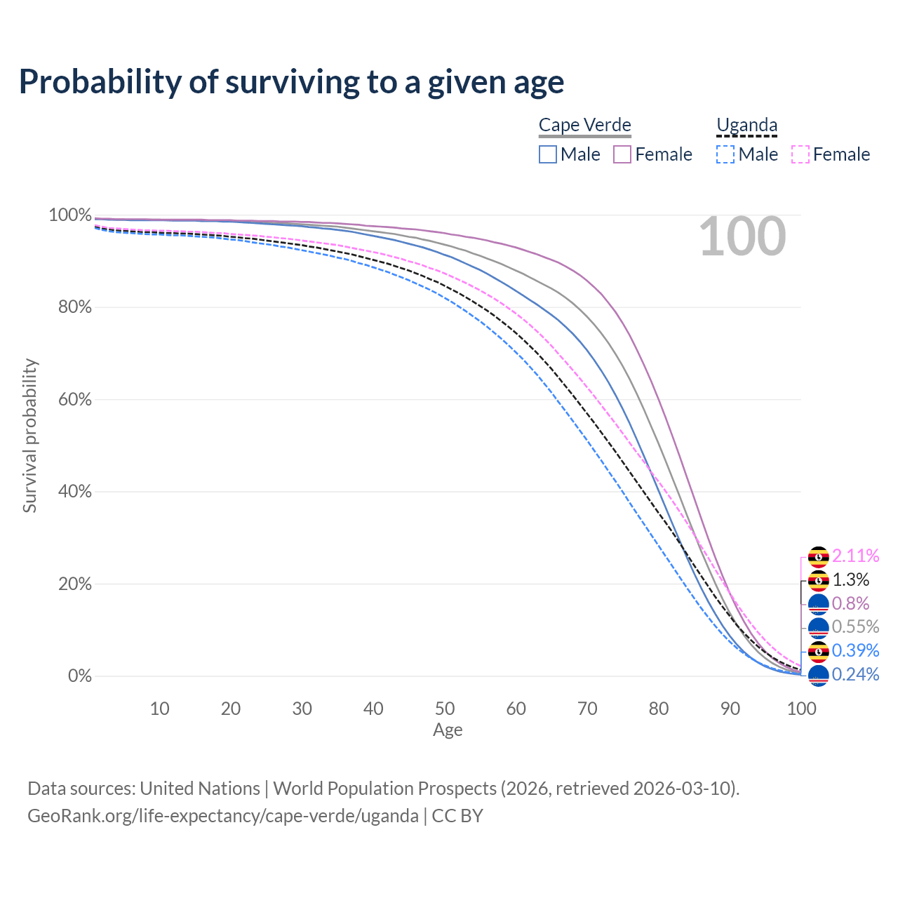 This life expectancy calculator shows the odds of living to 100, 95, 90, and below based on current age for both males and females in Cape Verde and Uganda, along with mean and median age of death. The calculations are based on the 2026 life tables (actuarial tables) from the UN World Population Prospects.