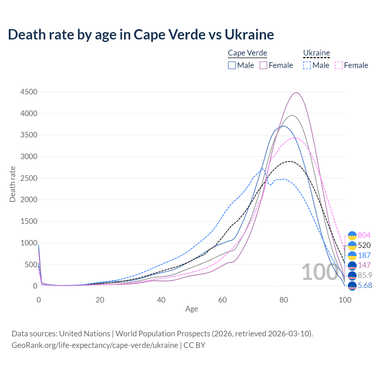 This life expectancy calculator shows the odds of living to 100, 95, 90, and below based on current age for both males and females in Cape Verde and Ukraine, along with mean and median age of death. The calculations are based on the 2026 life tables (actuarial tables) from the UN World Population Prospects.