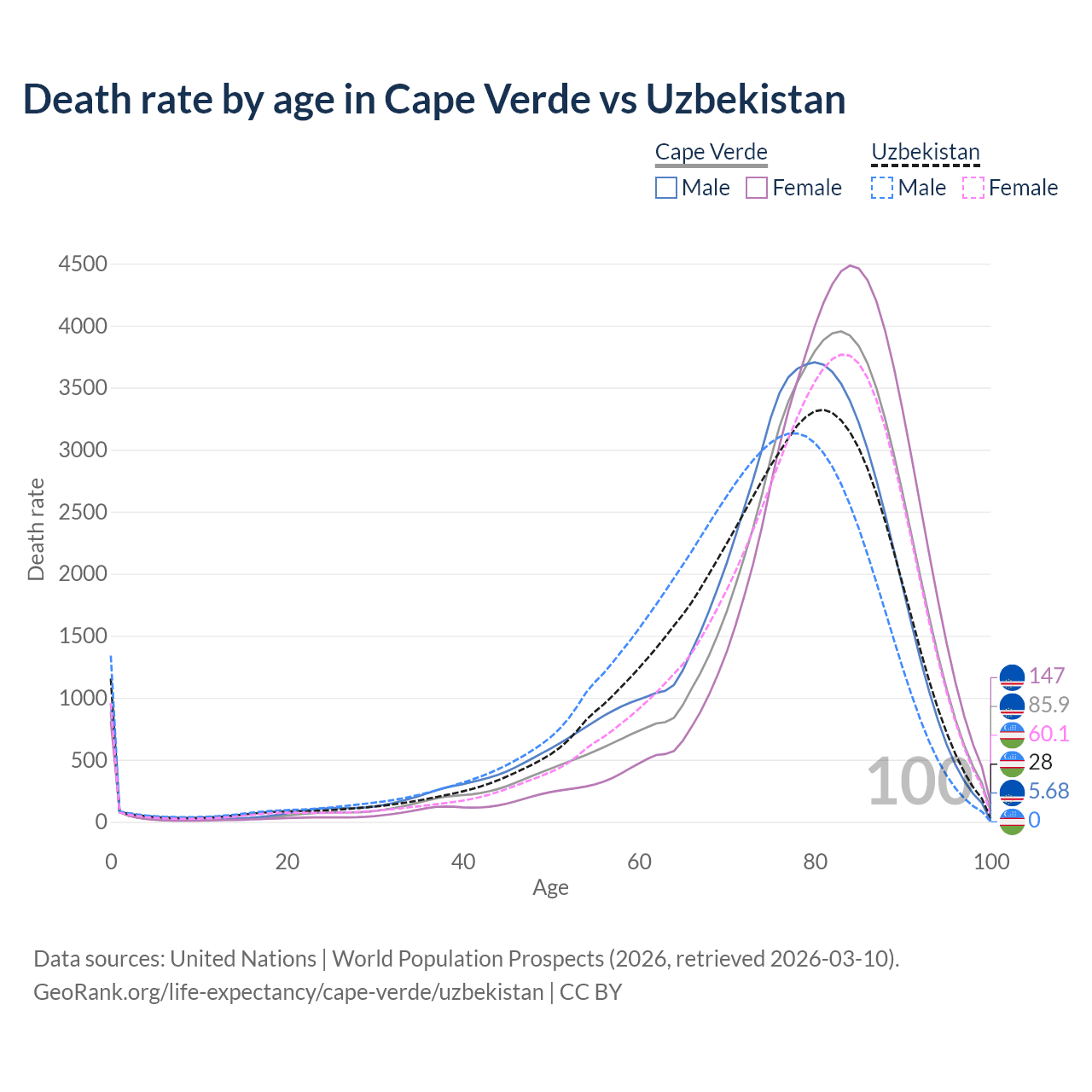 This life expectancy calculator shows the odds of living to 100, 95, 90, and below based on current age for both males and females in Cape Verde and Uzbekistan, along with mean and median age of death. The calculations are based on the 2026 life tables (actuarial tables) from the UN World Population Prospects.