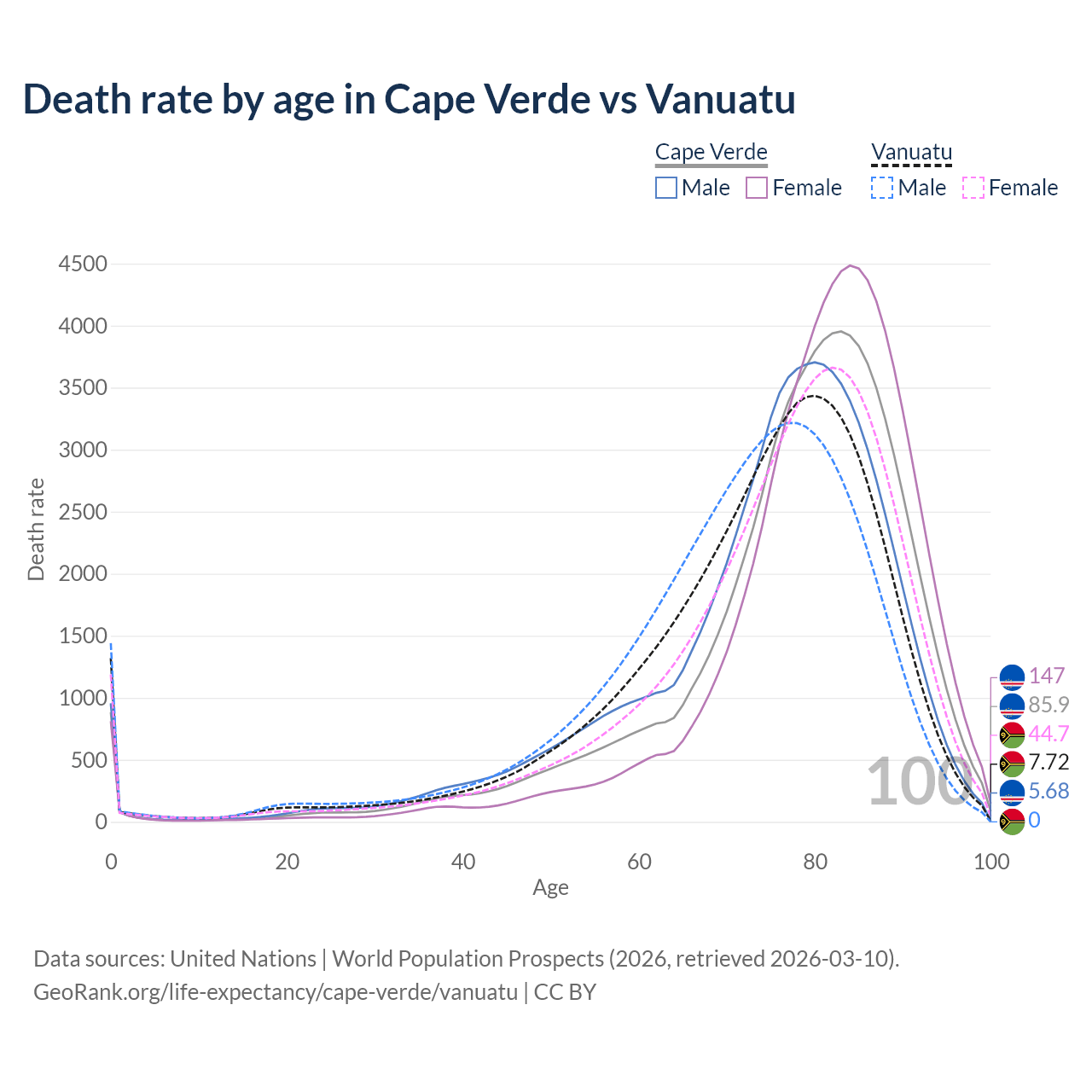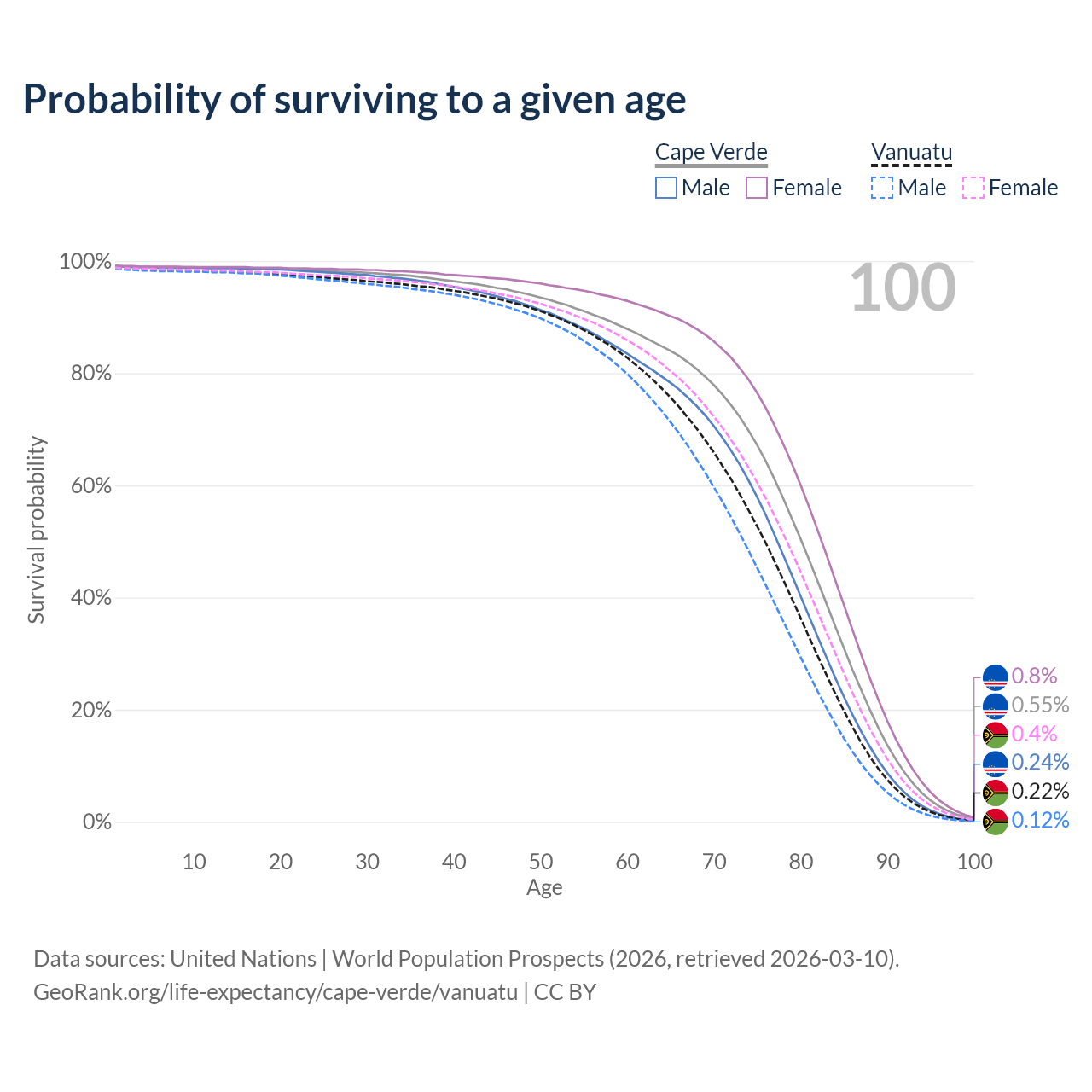 This life expectancy calculator shows the odds of living to 100, 95, 90, and below based on current age for both males and females in Cape Verde and Vanuatu, along with mean and median age of death. The calculations are based on the 2026 life tables (actuarial tables) from the UN World Population Prospects.