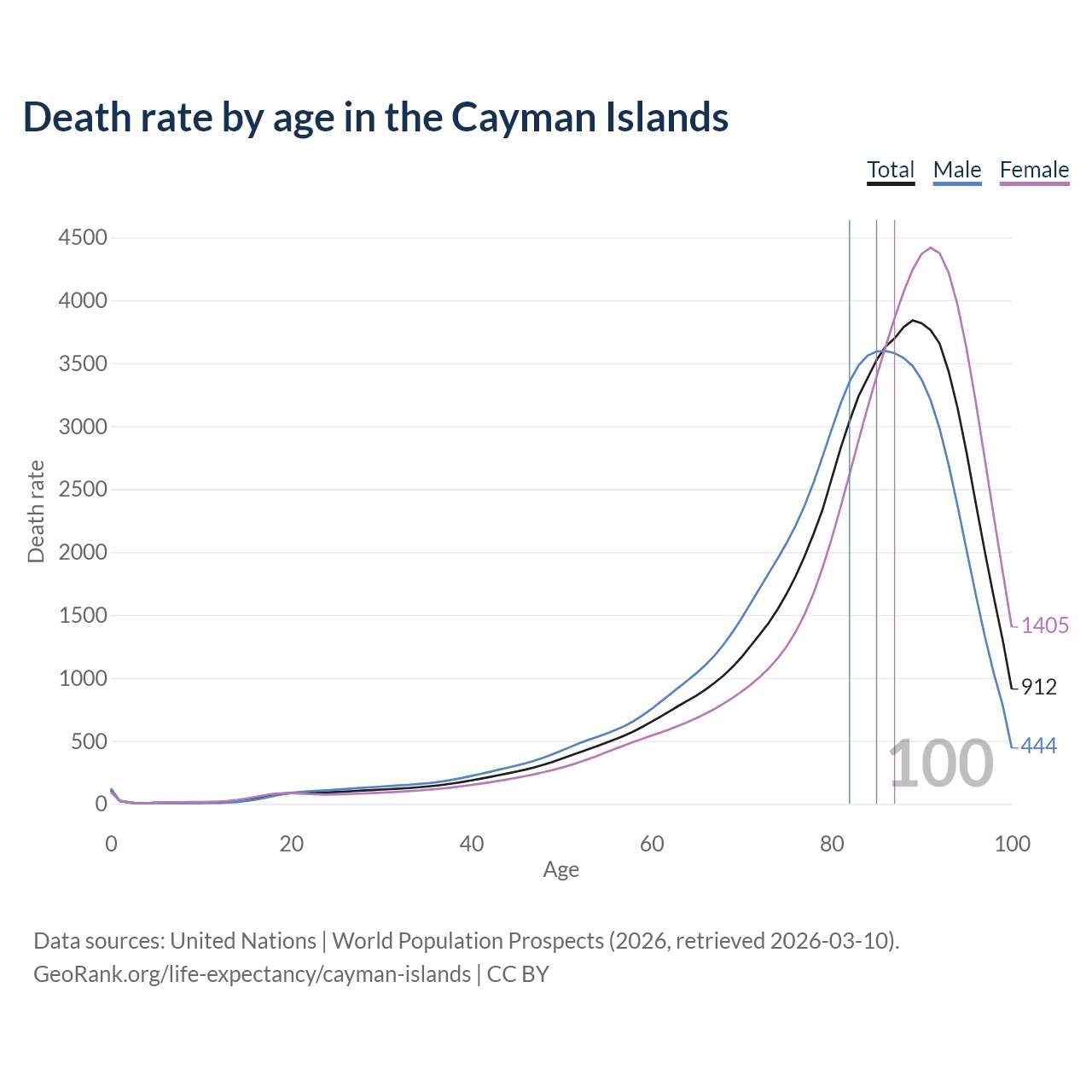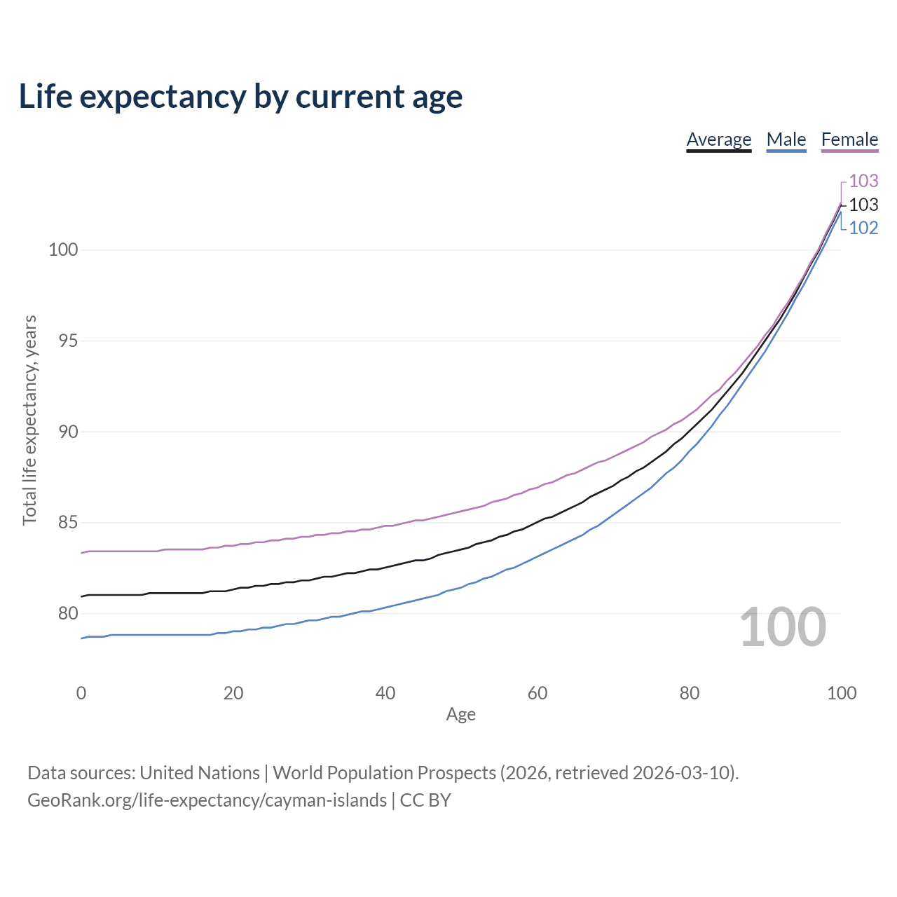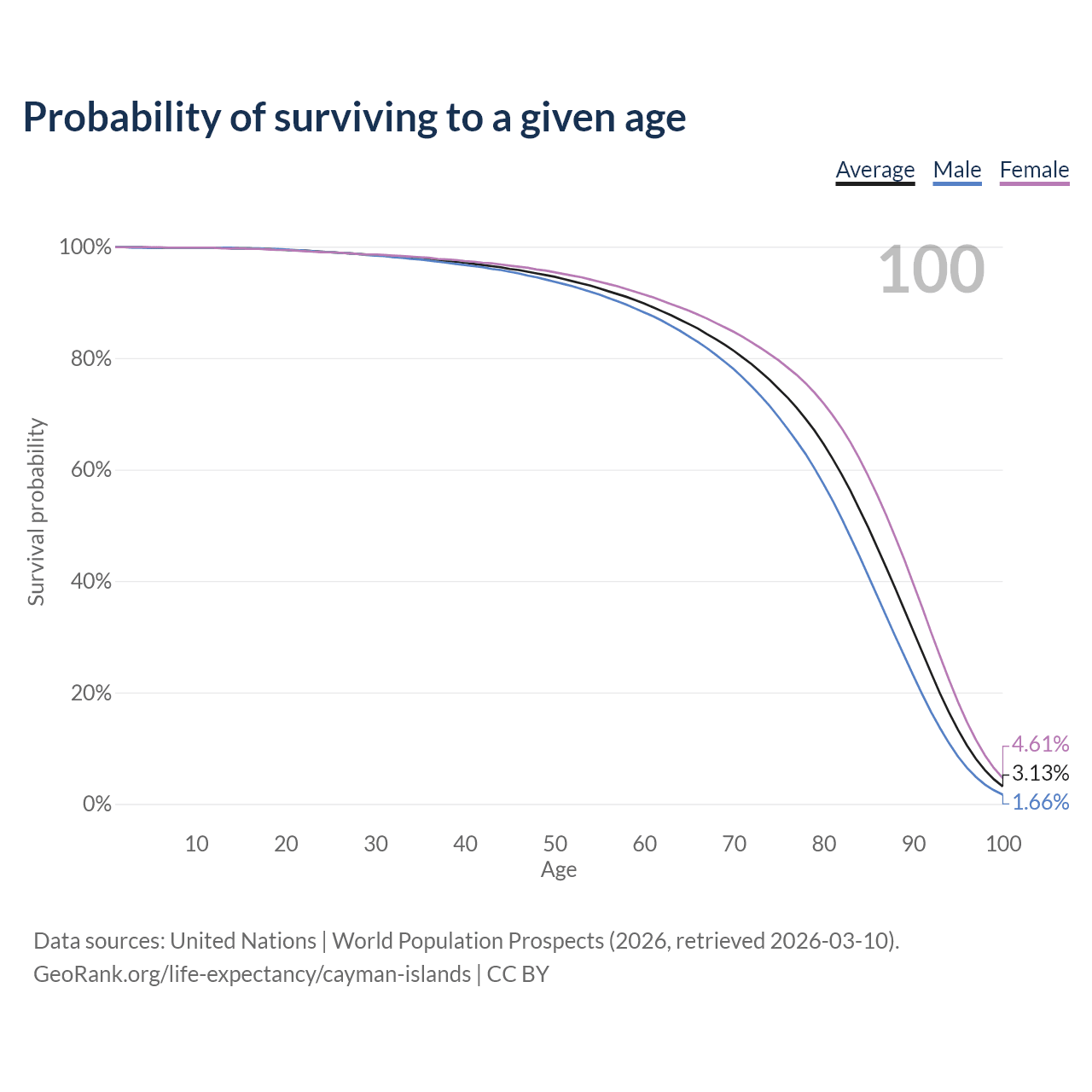 This life expectancy calculator shows the odds of living to 100, 95, 90, and below based on current age for both males and females in the Cayman Islands, along with mean and median age of death. The calculations are based on the 2026 life tables (actuarial tables) from the UN World Population Prospects.