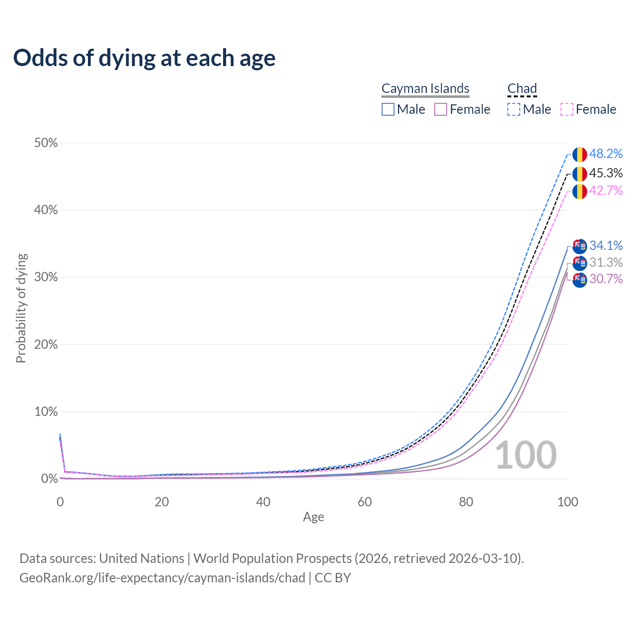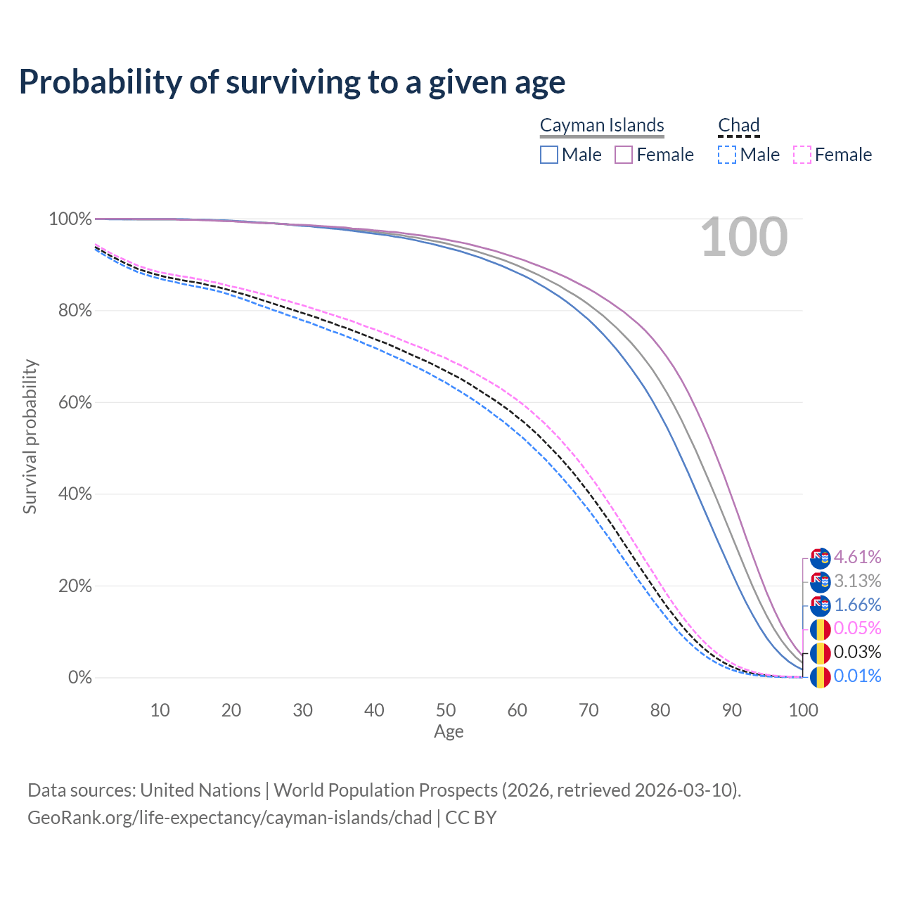 This life expectancy calculator shows the odds of living to 100, 95, 90, and below based on current age for both males and females in the Cayman Islands and Chad, along with mean and median age of death. The calculations are based on the 2026 life tables (actuarial tables) from the UN World Population Prospects.